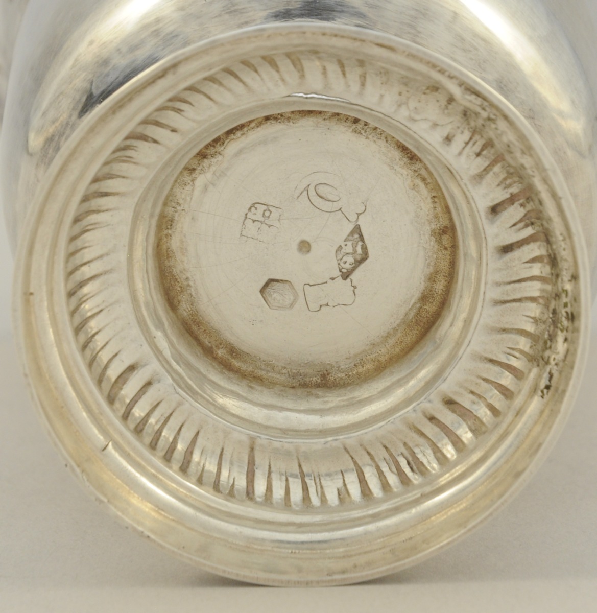 TOURS. TIMBALE dite TULIPE en argent uni reposant sur un piédouche. Le col martelé marqué "A ROUSSEAU J BLOT" porte une inscription biffée.