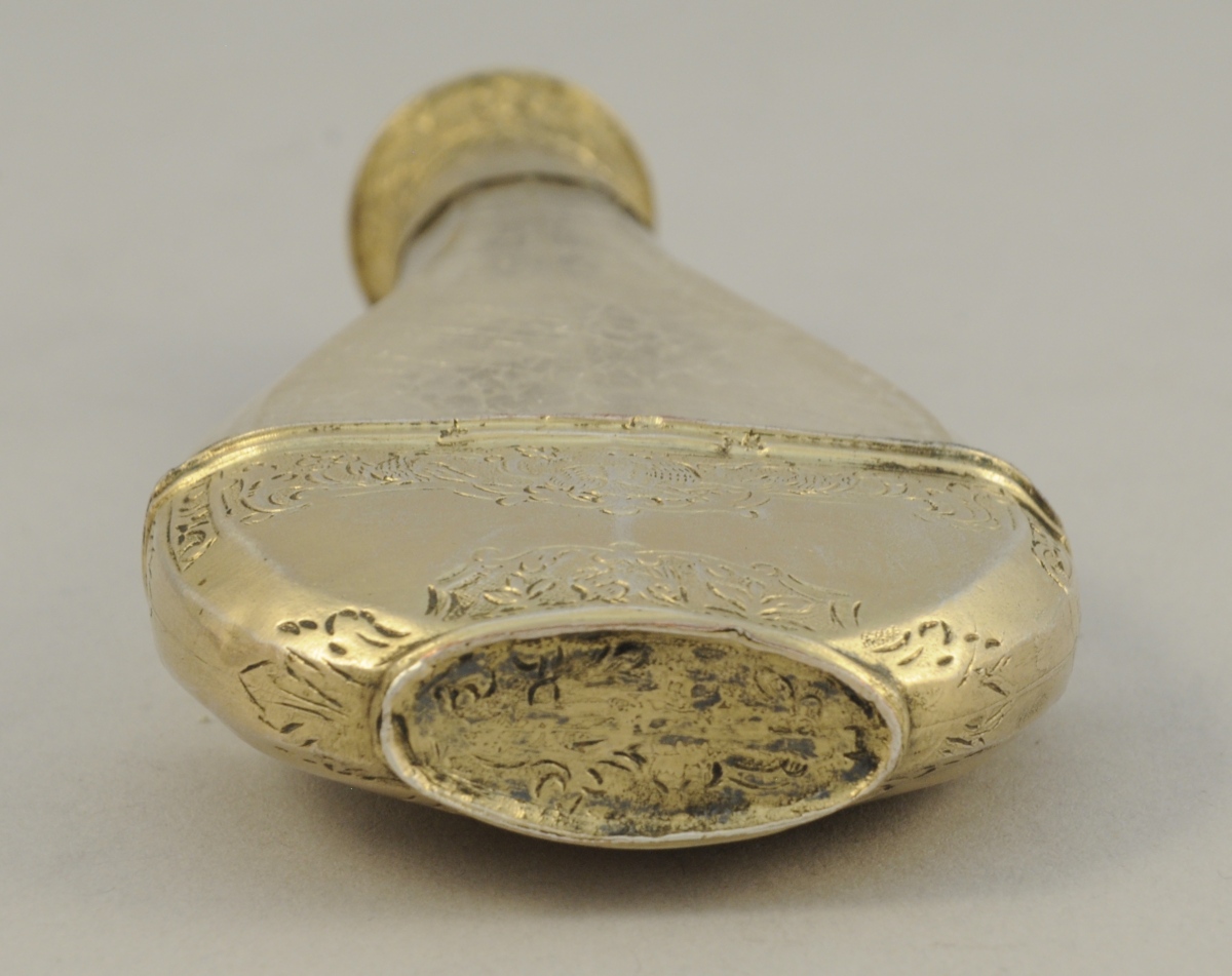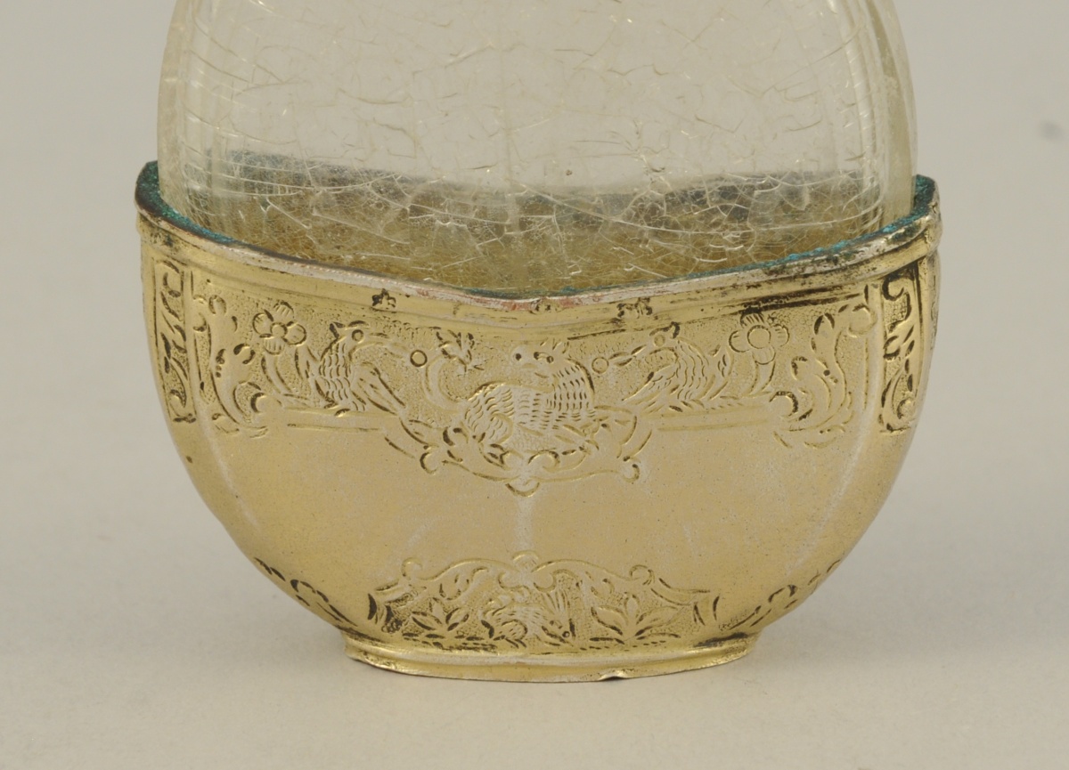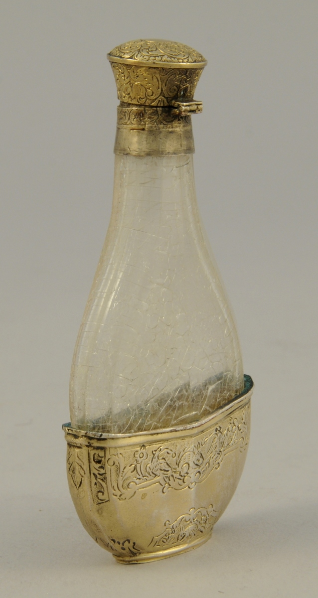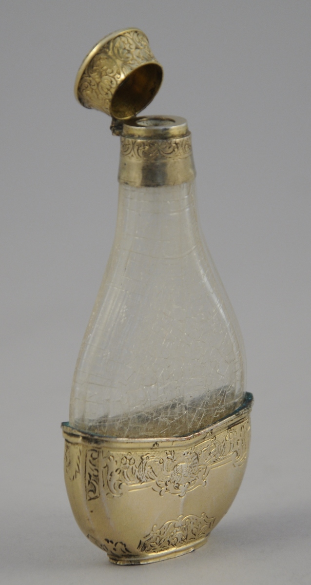 FLACON à parfum, réceptacle en cristal de roche (?). Bouchon et monture envermeil gravé de scènes d'oiseaux et de lapins.