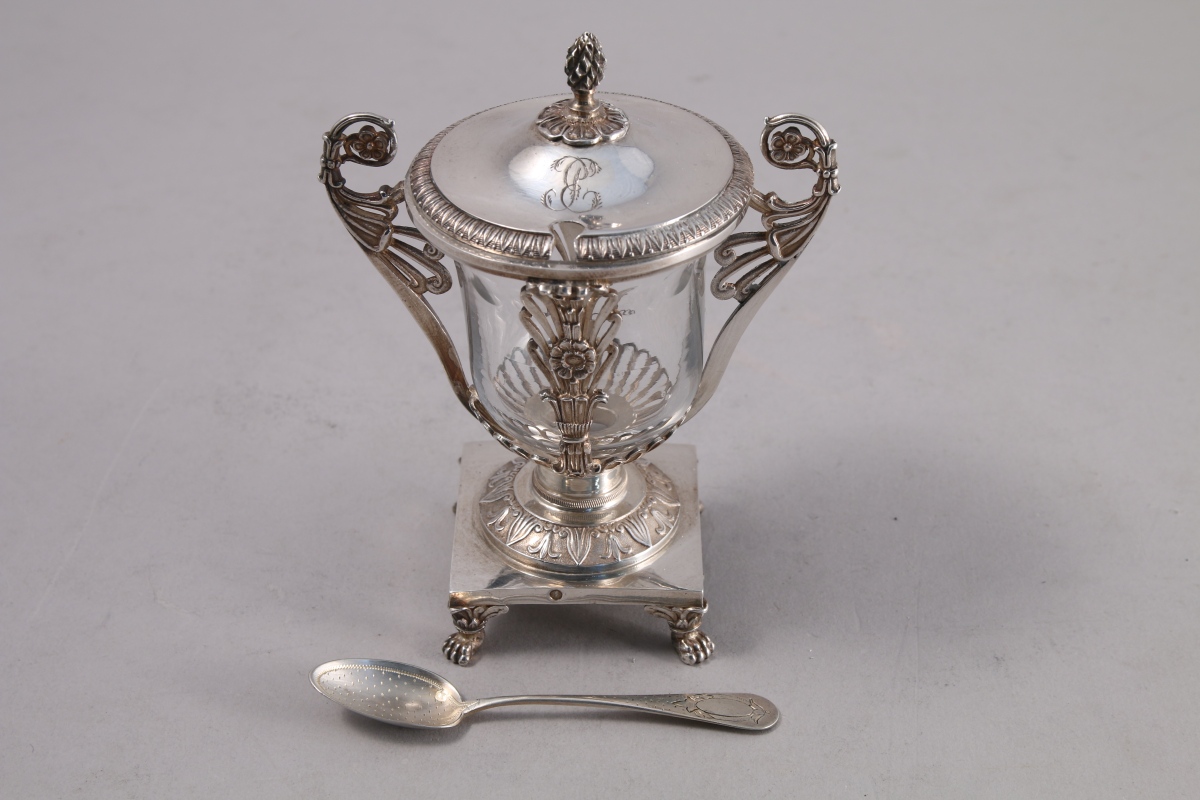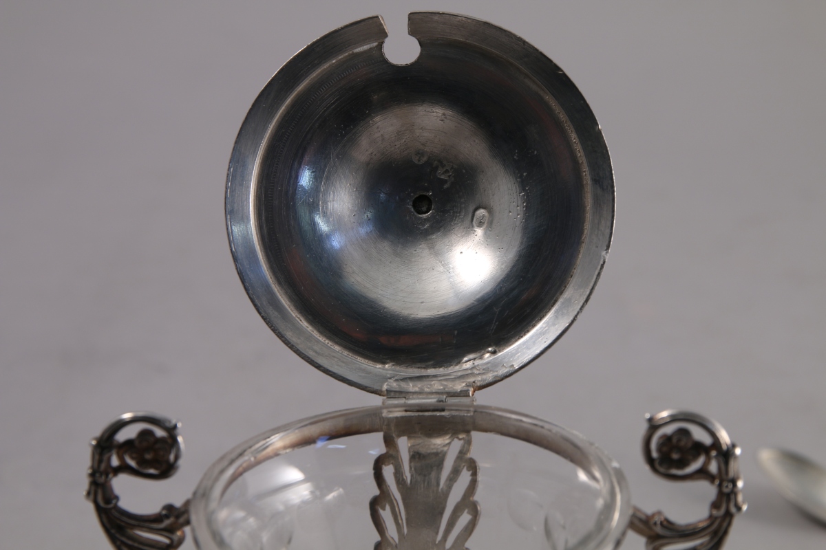 MOUTARDIER en argent, le couvercle de forme circulaire orné d'une frise de feuilles de lotus et prise en pomme de pin. Deux anses à palmes enroulées et deux palmes fleuries ajourés reposent sur une base quadrangulaire ornée d'une frise de lotus et feuille d'eau, soutenue par quatre pieds griffes.
