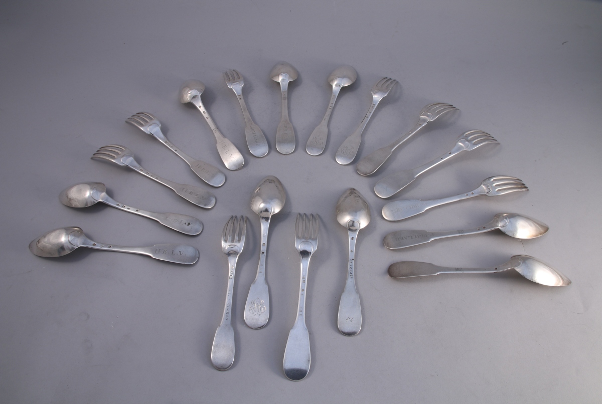- DEUX COUVERTS et une CUILLÈRE marqués "H.B.L.V". Deux fourchettes et une cuillère, 2nd Coq, Paris, 1809-1819. Deux cuillères, Vieillard, Paris, 1819-1838. Poids: 406 g.
