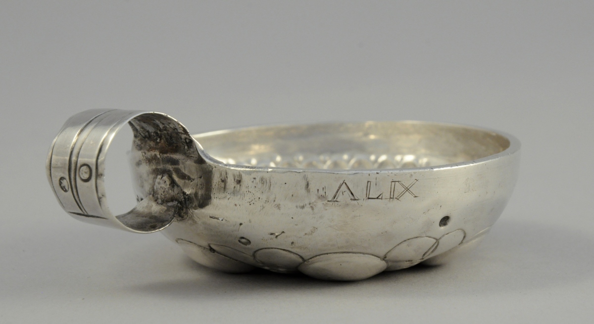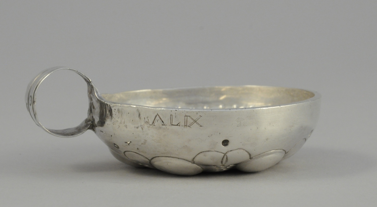 TASTEVIN en argent à décor de godrons, perles, cupules et pampres de vigne stylisés marqué "ALIX". Anse à enroulement cannelée.
