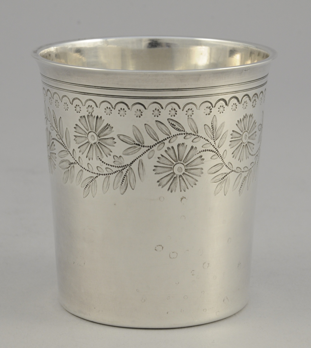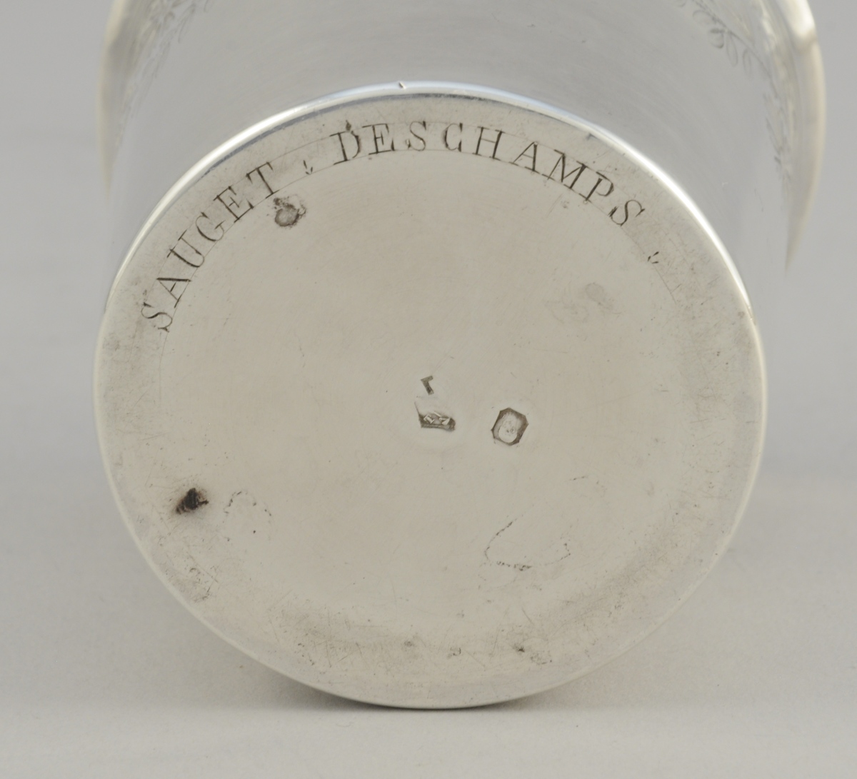 TIMBALE dite de COLLÉGIEN en argent gravée d'une guirlande fleurie. Marquée en dessous "Sauget Deschamps".