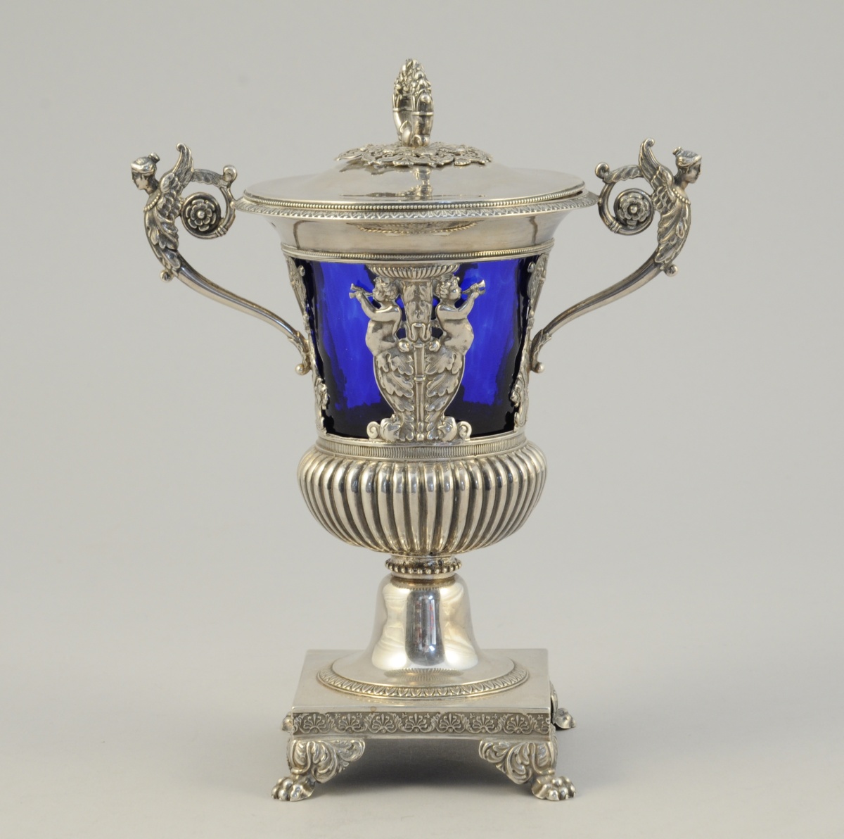 DRAGEOIR adoptant la forme d'un vase médicis en argent. Le corps est ciselé et ajouré de putti phytomorphes jouant de l'aulos, de têtes de lion ailées, de fleurons et de feuillages. Anses latérales à buste de sirène phytomorphe et enroulement. La panse basse godronnée et la base du piédouche à frise de feuilles d'eau. La base de forme carrée ornée de palmettes repose sur quatre pieds griffes à attache feuillagée. La prise et sa terrasse ajourés de feuillages stylisés, cornes d'abondance et masque de faune.