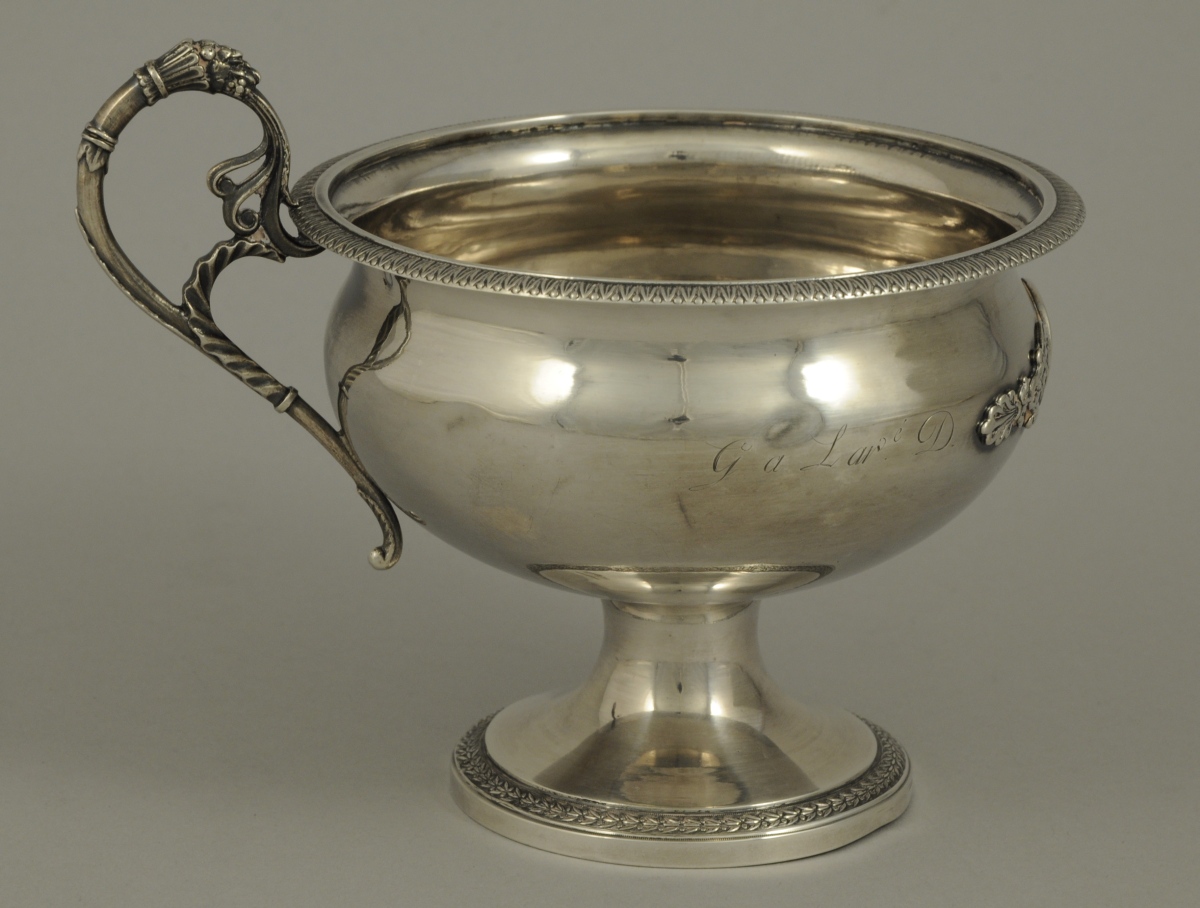 COUPE DE MARIAGE en argent. Le col ciselé d'une frise de feuilles d'eau. L'anse à corne d'abondance et volutes feuillagées. La panse à décor appliqué d'un médaillon figurant une tête de femme flanquée de motifs floraux et palmettes. Elle repose sur un piédouche à frise feuillagée. Gravée " G a Laré. D / Le 27 aoust 1823" et monogrammée "DA".