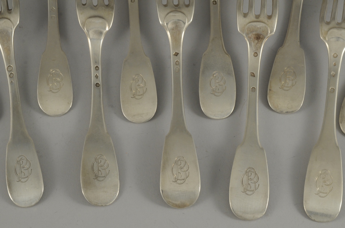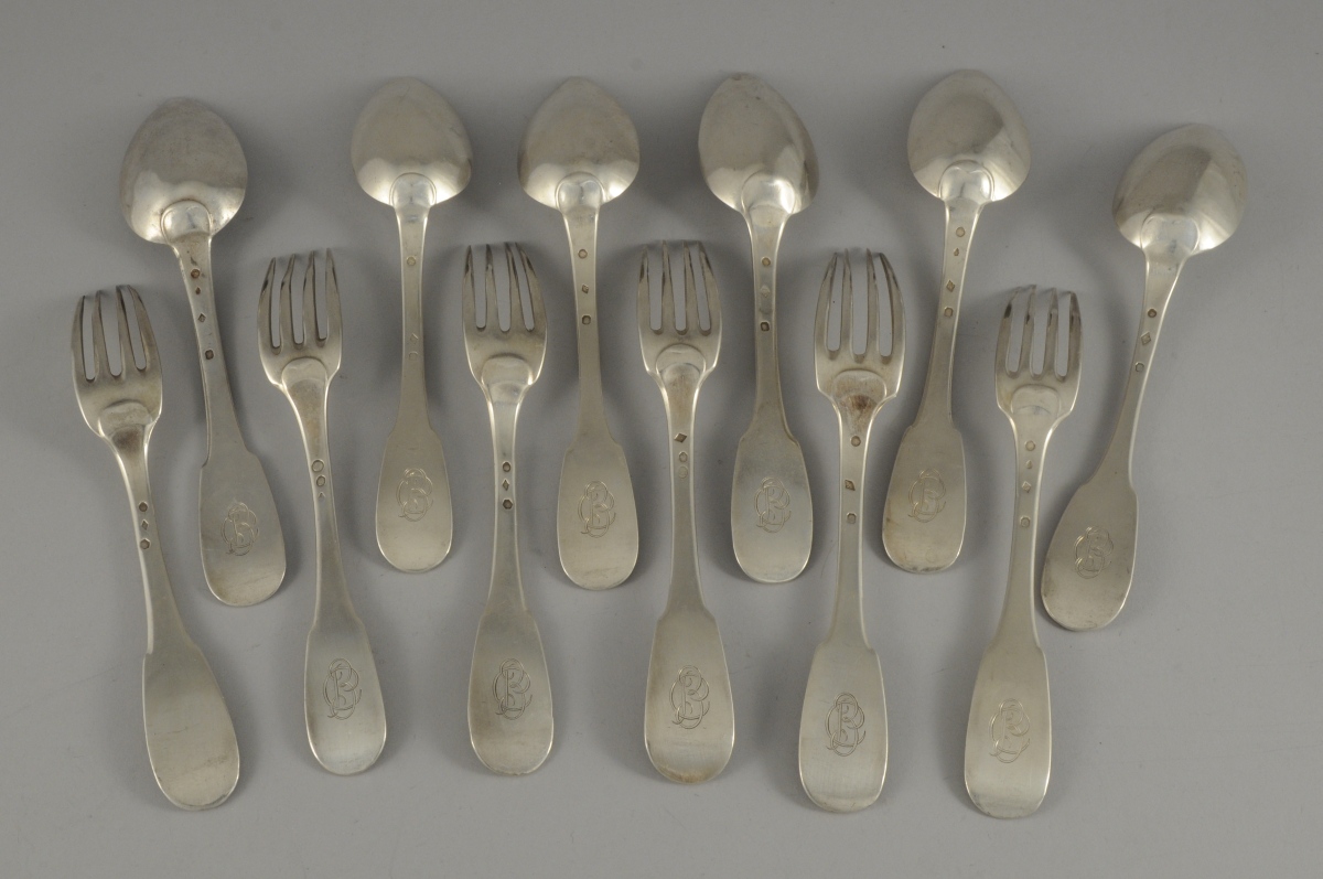 Série de 6 FOURCHETTES et 6 CUILLÈRES DE TABLE en argent, d'un même modèle uniplat: