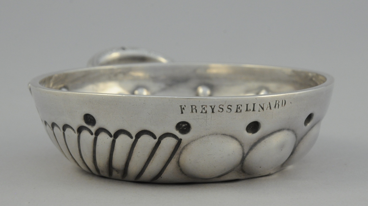 TASTEVIN en argent à décor de godrons, perles et cupules marqué "FREYSSELINARD". Anse serpentiforme ciselée d'écailles.