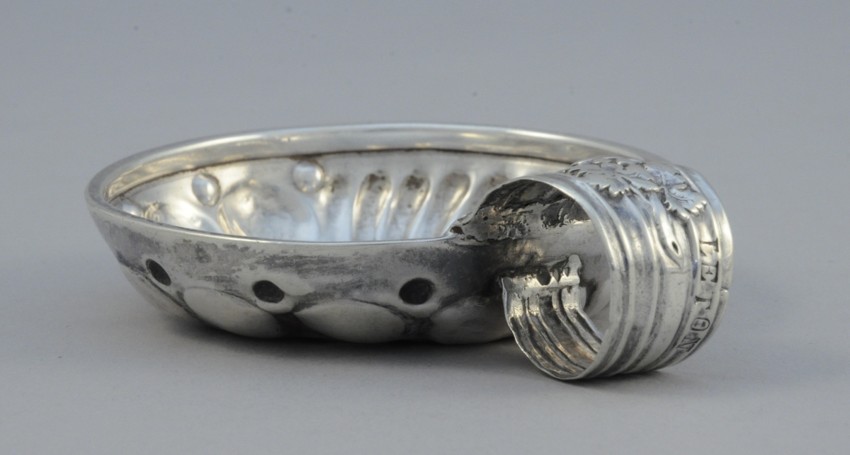 TASTEVIN en argent à décor de godrons, perles et cupules marqué "LETON AU MEE". Anse à enroulement cannelée ornée d'un pampre de vigne et marquée "LETON".