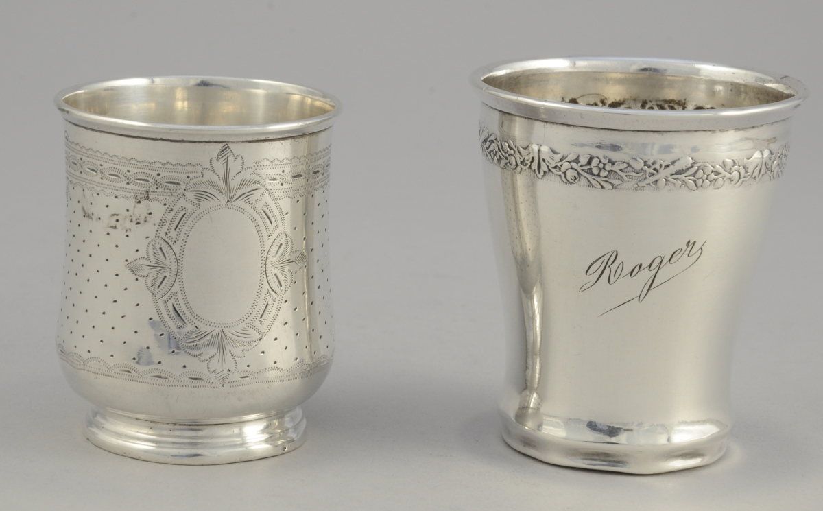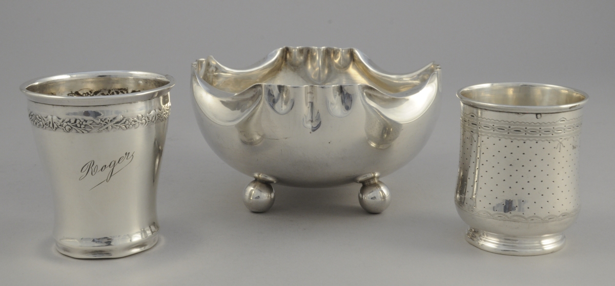 DEUX TIMBALES et une COUPE en argent. Une timbale guillochée à panse bombée avec un cartouche vierge, l'autre ornée d'une frise fleurie et marquée "Roger". La coupe de forme ronde à col pincé reposant sur quatre pieds boules.