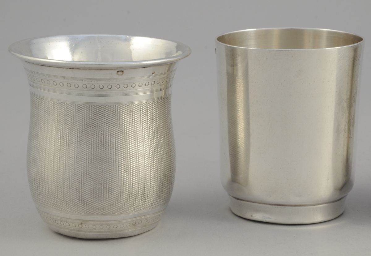 -La première en argent uni reposant sur un talon. Haut. 7,5, Diam. 6,5 cm. Poids: 78 g.
