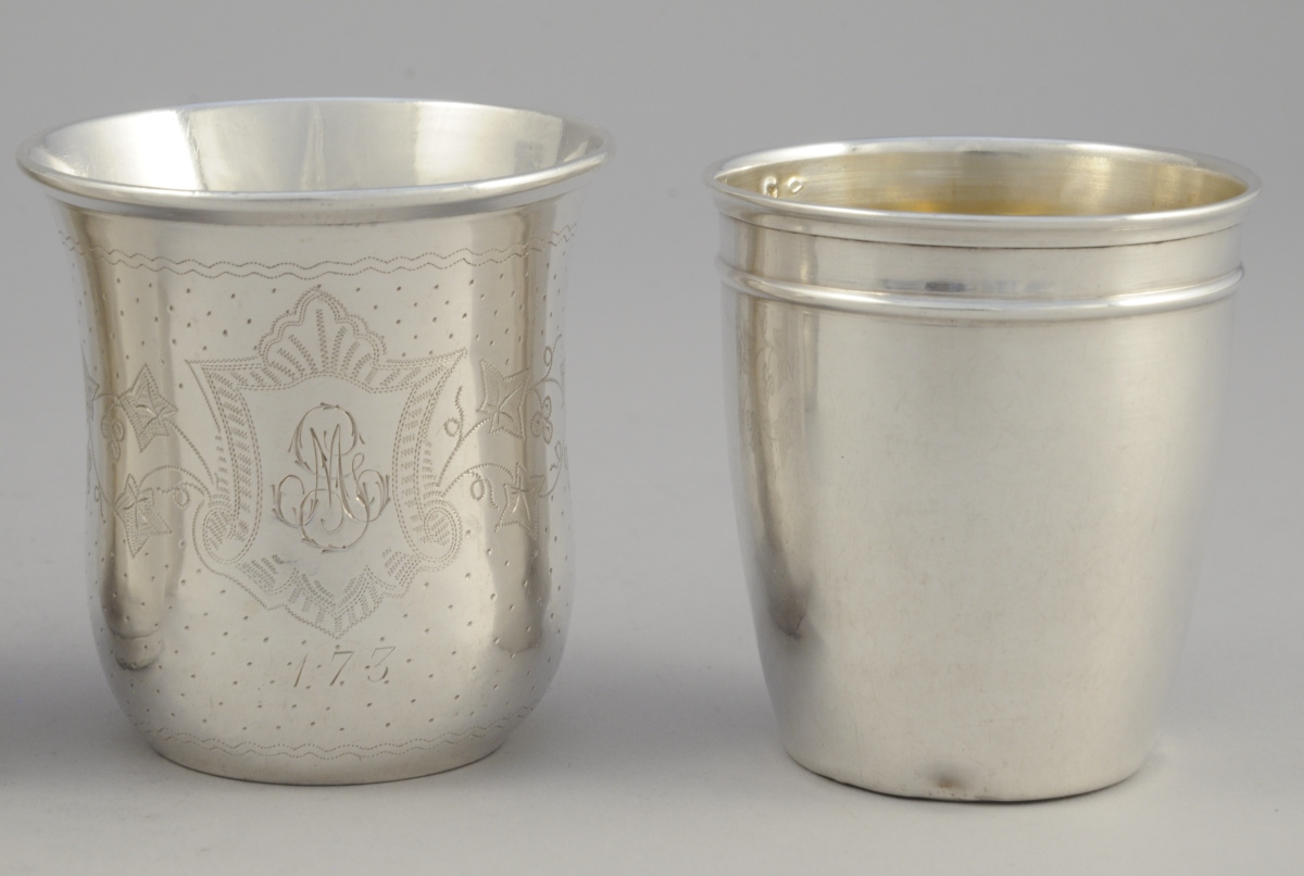 -La deuxième à col évasé et panse basse ornée d'une frise de laurier centrée d'un cartouche monogrammé "GM". Haut. 7,5, Diam. 7,5 cm. Poids: 66 g.