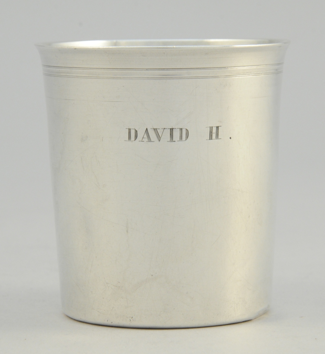 -La quatrième de forme tronconique en argent uni. Le col souligné de filets. Marquée "DAVID H.". Haut. 7, Diam. 6,5 cm. Poids: 54 g.