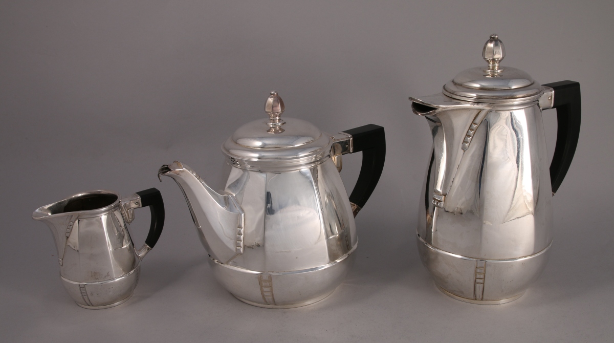 SERVICE à THÉ-CAFÉ en argent, 3 pièces, à pans coupés et côtes saillantes. Fretel en pomme de pin stylisée, manche en bois noirci. Il se compose d'une théïère, d'une cafetière et d'un pot-à-lait.