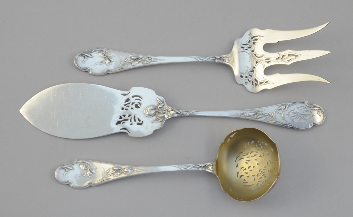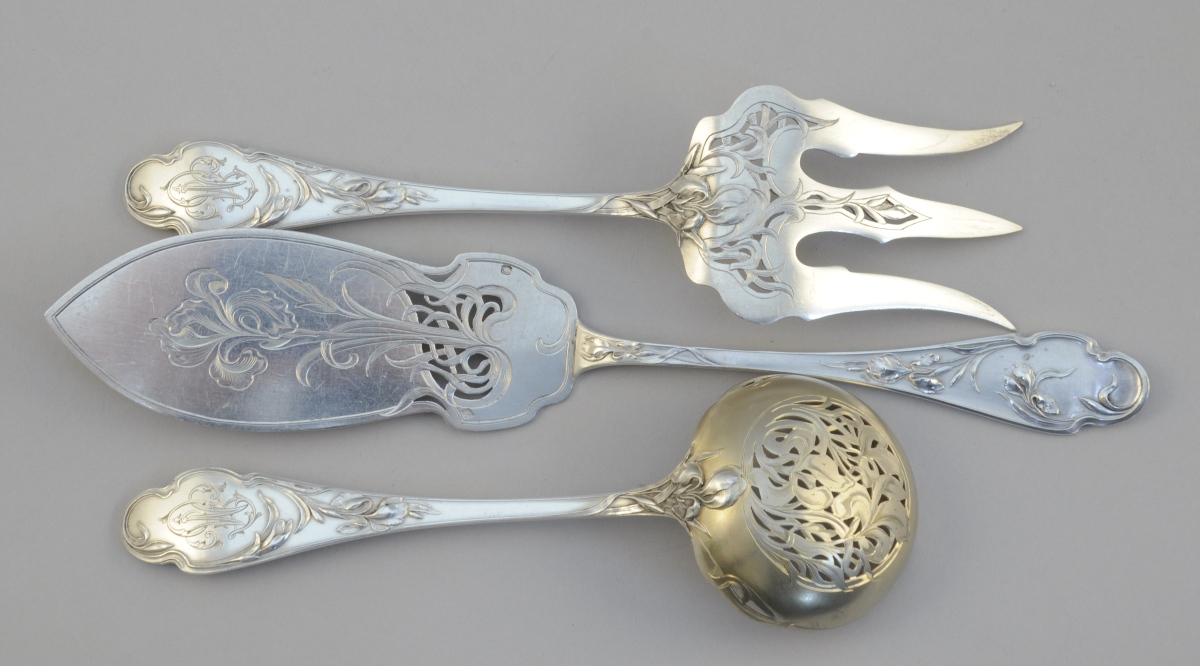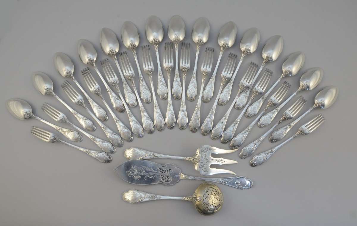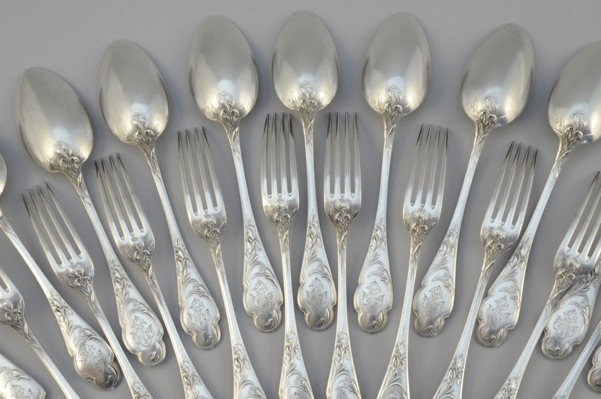 MÉNAGÈRE ART NOUVEAU en argent, 67 pièces à motifs d'iris monogrammées "MT". Elle se compose de 16 couverts de table, 16 couverts à entremets (manque une cuillère), une saupoudreuse ainsi qu'un couteau et une fourchette pour servir le poisson.