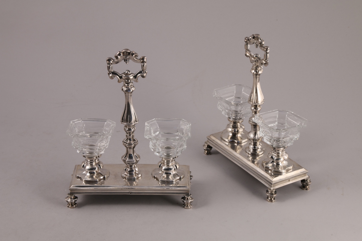 Paire de SALIÈRES-POIVRIÈRES en argent. Les godets de forme octogonale en cristal taillé à pans. Ils sont insérés dans un piédouche reposant sur une terrasse de forme rectangulaire à doucine. Prise en partie centrale, fût balustre, partie supérieure à motif de cuirs découpés. Piètement quadripode balustre.