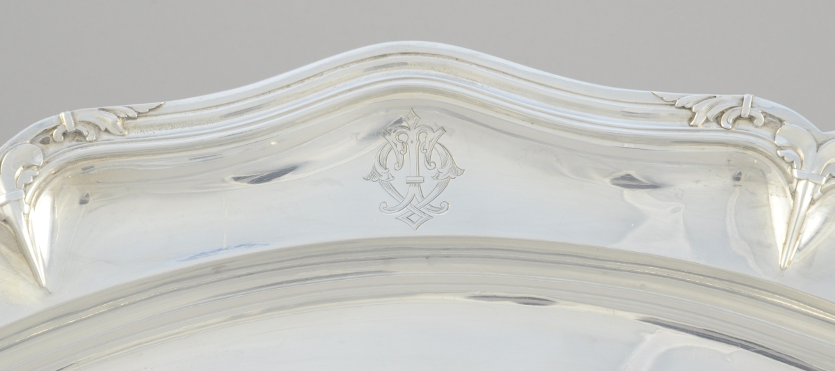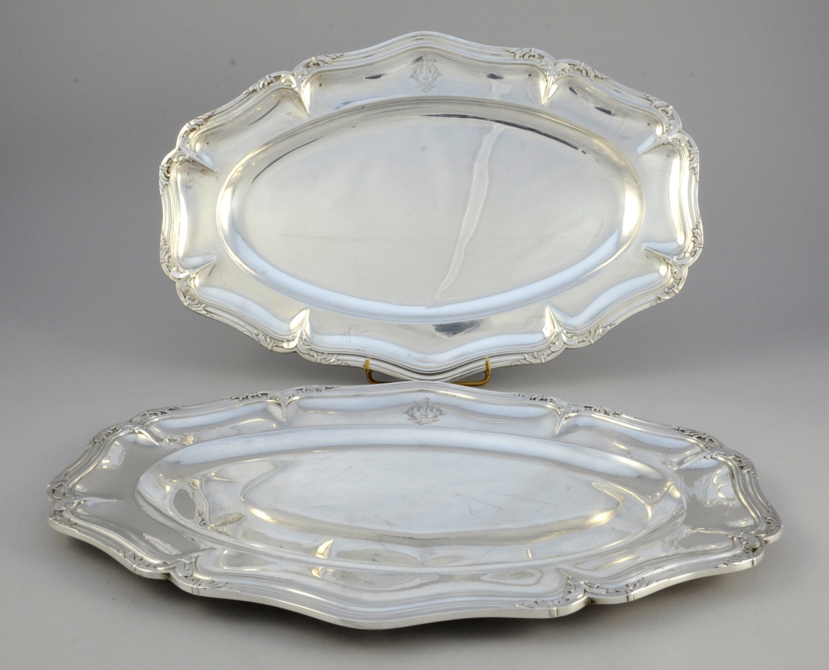 PUIFORCAT. PAIRE DE PLATS en argent de forme oblongue à bords mouvementés, ornés de feuilles et agrafes et monogrammé "T".