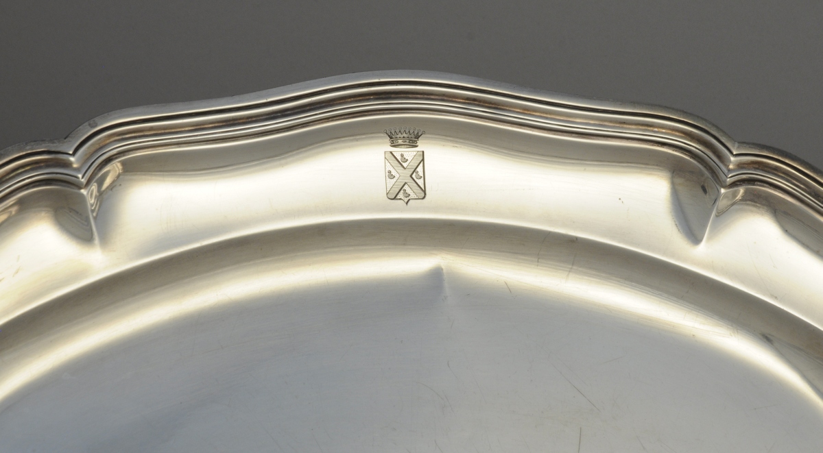 - Le second par ODIOT. L'aile gravée d'armoiries (d'or au sautoir d'azur accompagné de quatre merlettes de sable) timbrées d'une couronne comtale. Poinçon Minerve, XIXe.