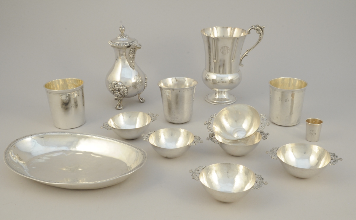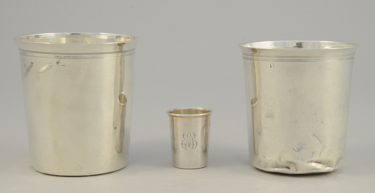 - Deux TIMBALES tronconique dites de COLLÉGIEN. L'une monogrammée "RB", l'autre "281 EB". Poinçon Minerve, XIX-XXe. Haut. 8 et 7,5 cm. Poids total: 164 g. (chocs)