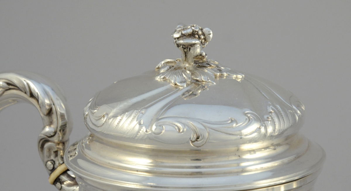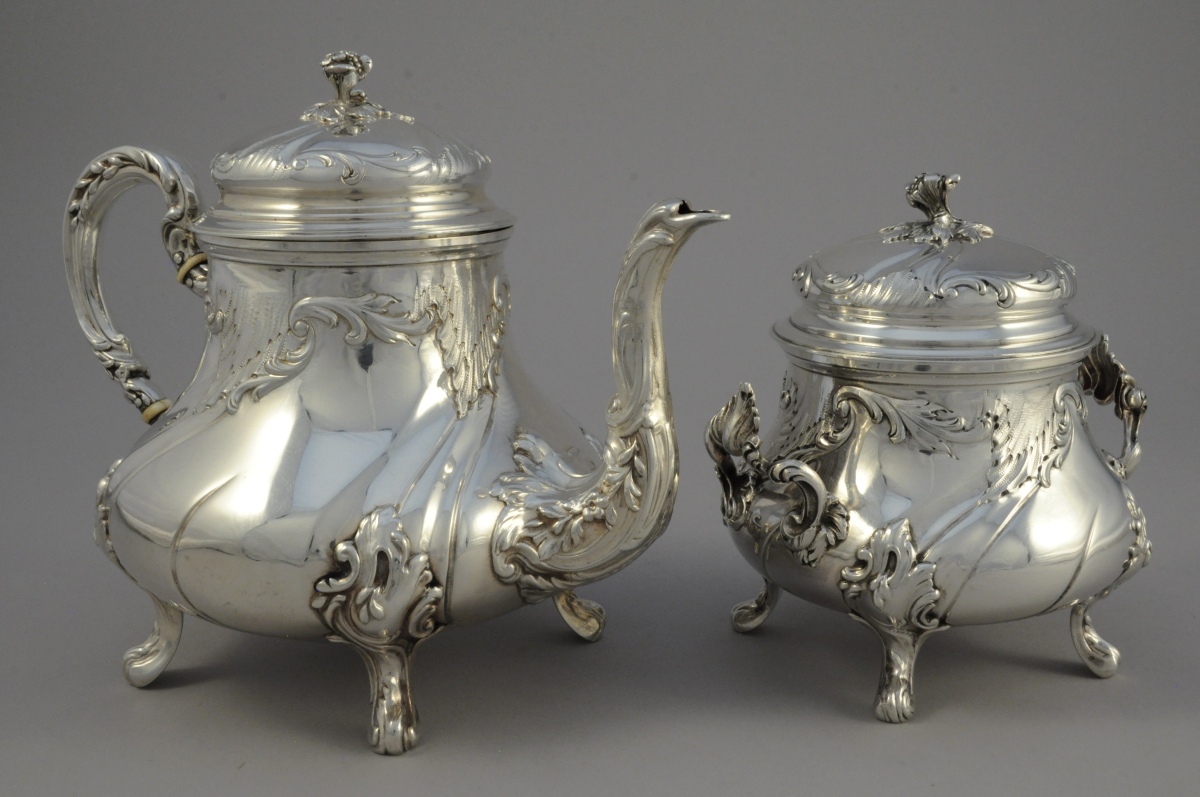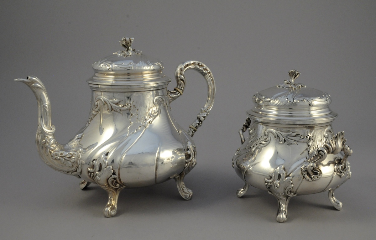 SERVICE À THÉ, 3 pièces, en argent à décor de côtes torses, volutes et feuillages stylisés. Il se compose d'une théière, d'un sucrier et d'un pot-à-lait. Fretel figurant un bouquet de fleurs reposant sur une feuille. Piètement quadripode à enroulement à attache feuillagée. La théière baguée d'ivoire. Monogramme "HP" sous la panse.