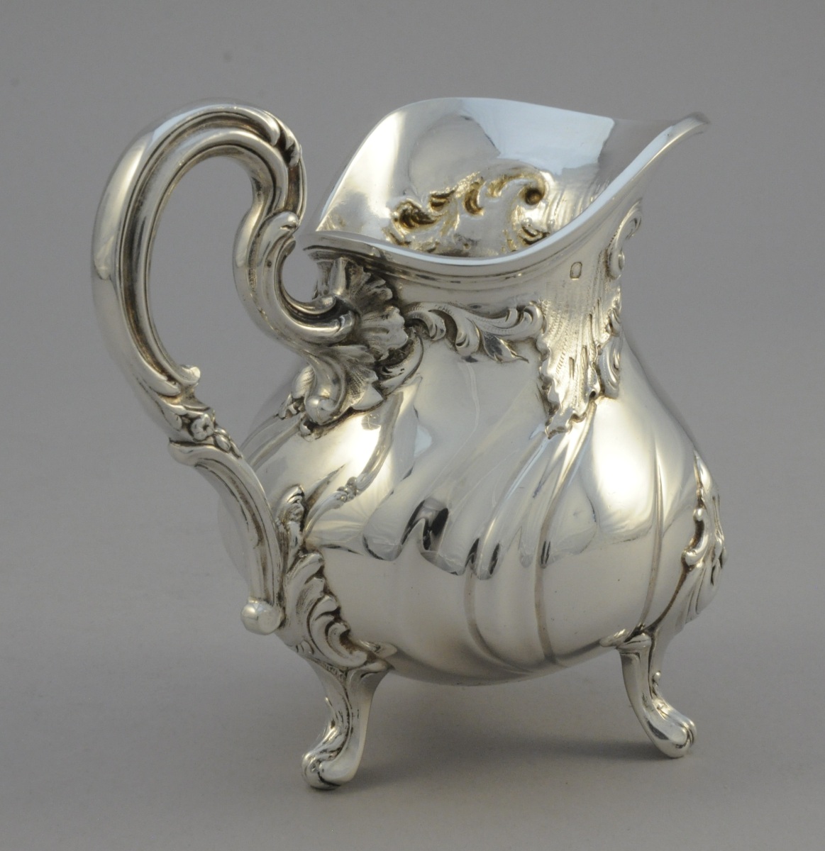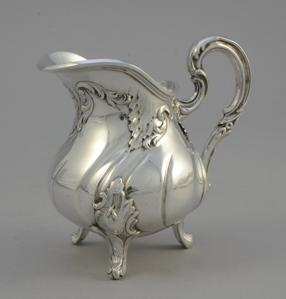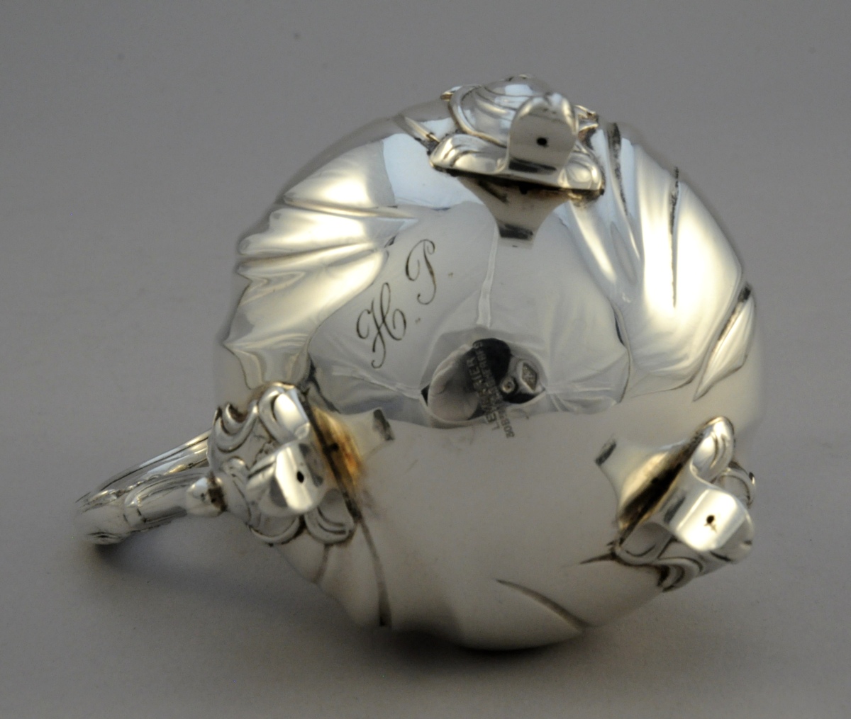 SERVICE À THÉ, 3 pièces, en argent à décor de côtes torses, volutes et feuillages stylisés. Il se compose d'une théière, d'un sucrier et d'un pot-à-lait. Fretel figurant un bouquet de fleurs reposant sur une feuille. Piètement quadripode à enroulement à attache feuillagée. La théière baguée d'ivoire. Monogramme "HP" sous la panse.