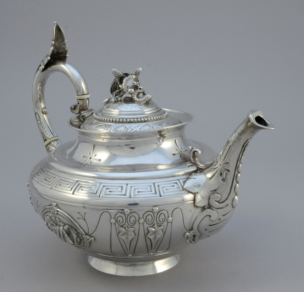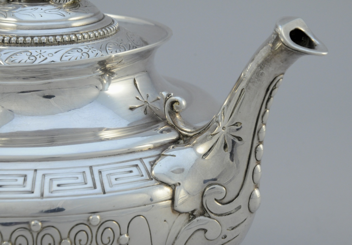THÉIÈRE en argent ciselée d'un riche décor tel que frise de grecques, feuillages stylisés et palmettes. Le corps flanqué de deux médaillons à attributs musicaux. Le fretel composé d'un masque de tragédie, d'une coupe, de branches de lierre et de deux thyrses.
