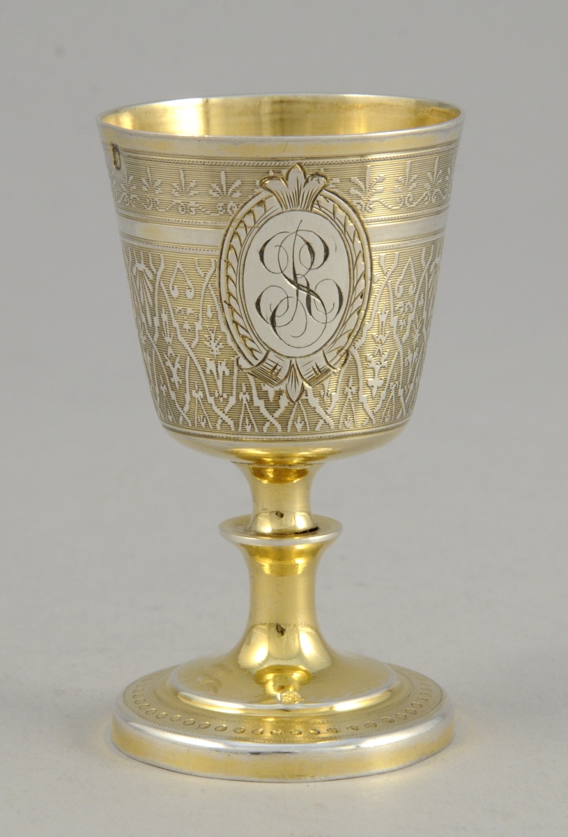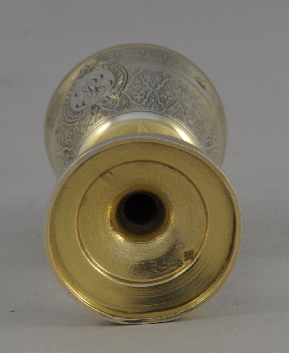 -COQUETIER sur haut piedouche en vermeil. Décor de palmettes et feuillages stylisés sur fond strié. Cartouche monogrammé "SR". Maître-Orfèvre: Delacquis.