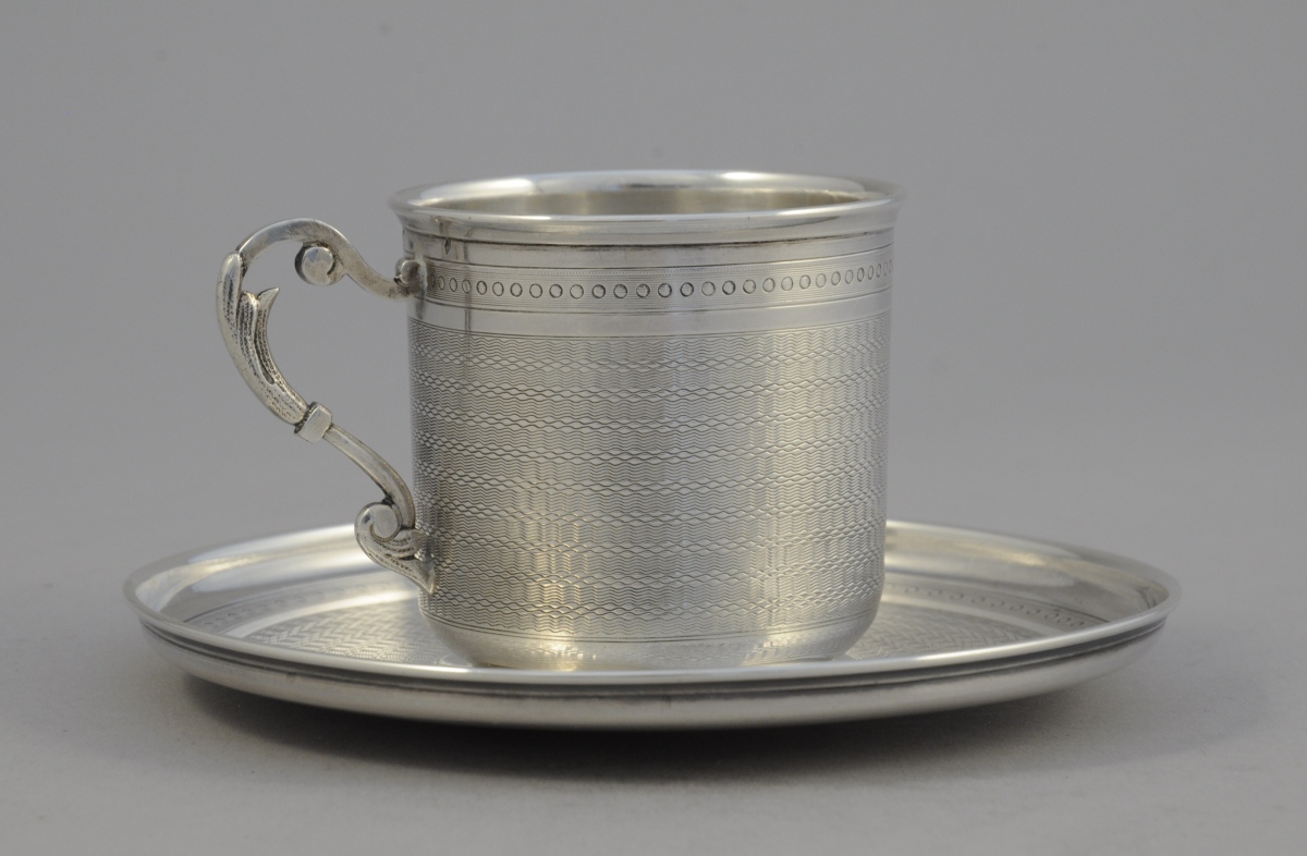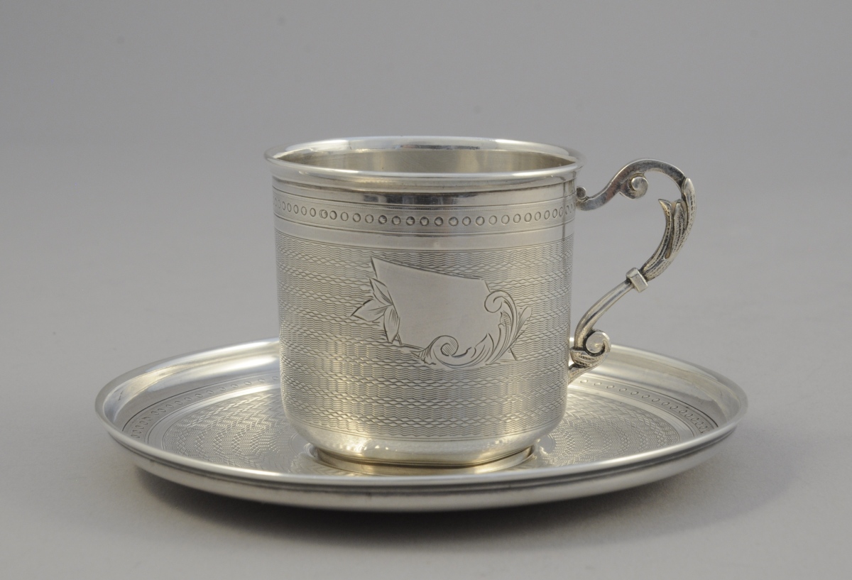 -TASSE À CAFÉ et sa sous-tasse ornée de guillochis. La tasse agréméntée d'un cartouche feuillagé. Anse latérale à volutes feuillagées.