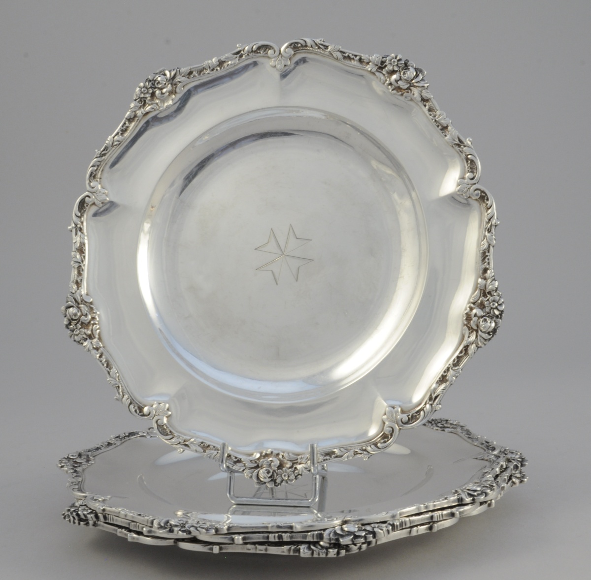 CARDEILHAC. SUITE DE QUATRE ASSIETTES en argent à bords chantournés. Les contours de l'aile finement ciselé de bouquets floraux et enroulements feuillagés. Le centre du bassin gravé d'une croix de Malte.