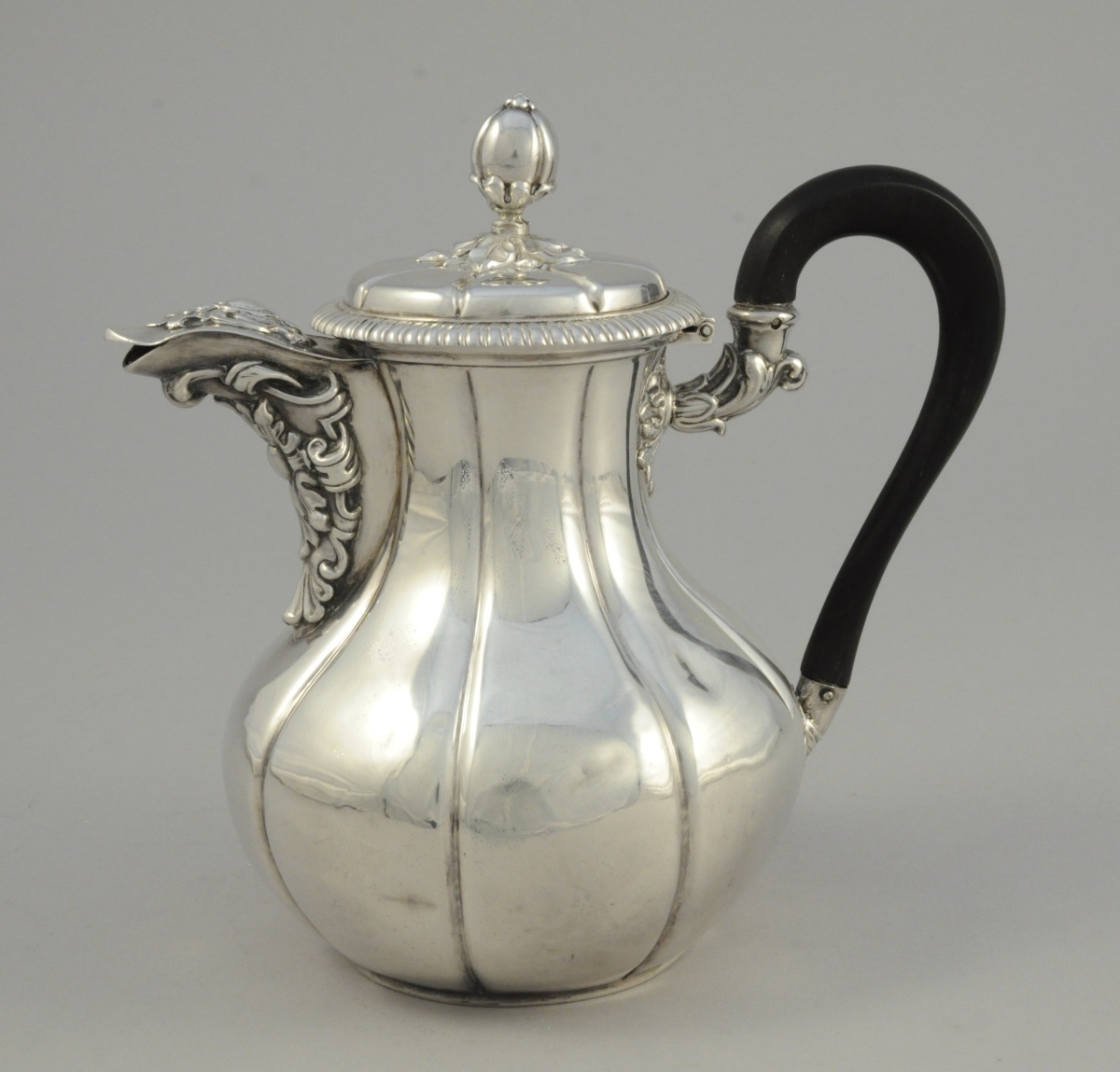VERSEUSE en argent à panse renflée à côtes de melon. Le bec orné d'un large fleuron inscrit dans un cartouche feuillagé. Le fretel en forme de graine sur une terasse de feuilles de chêne. Anse en bois noirci à attaches feuillagées.