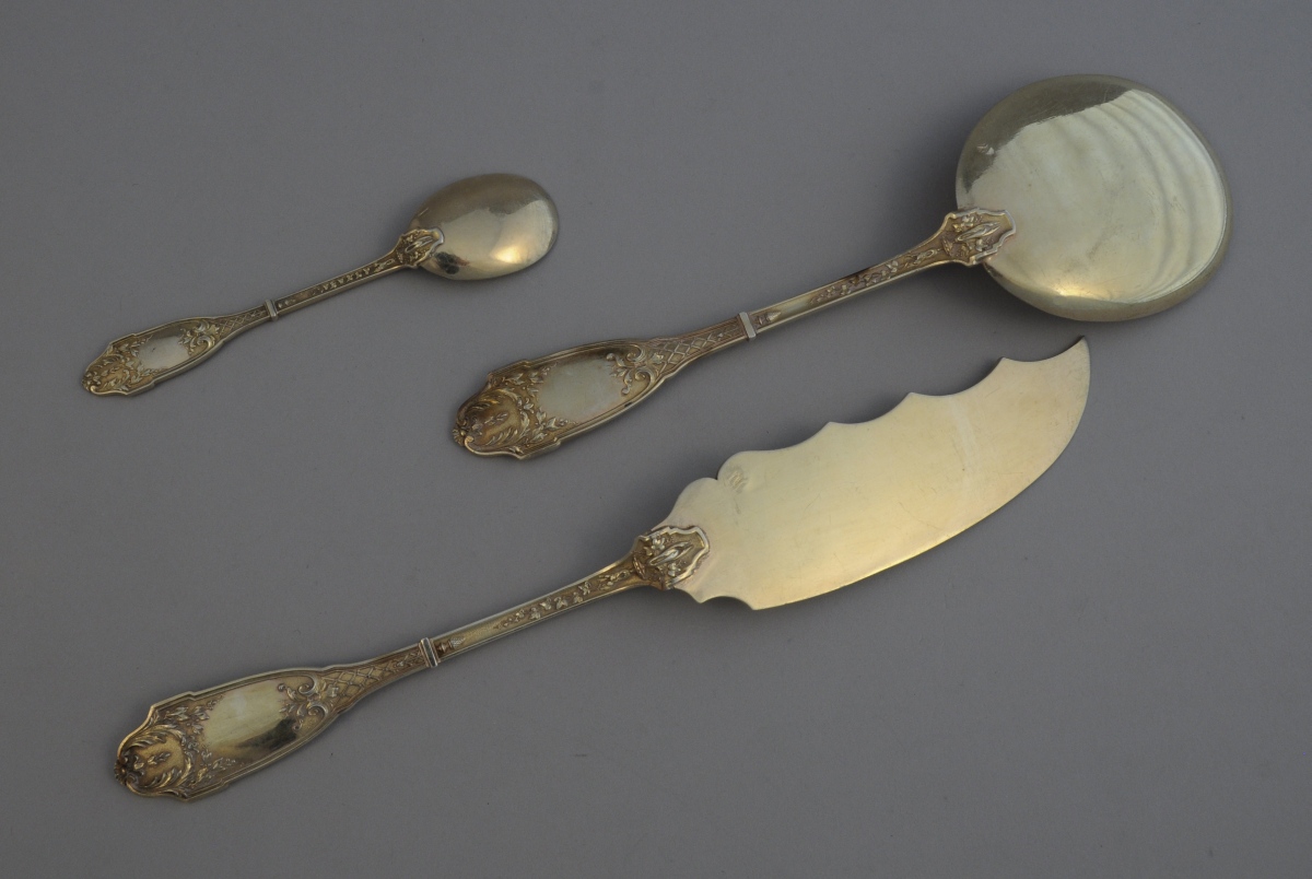 SERVICE À GLACE, 11 pièces, en vermeil. Riche décor bruni et amati de volutes, feuillages stylisés, rinceaux, croisillons, coquilles et fleurons. La spatule ornée d'un cygne aux ailes déployées. Il se compose d'une pelle et d'un couteau de service et de 9 cuillères.