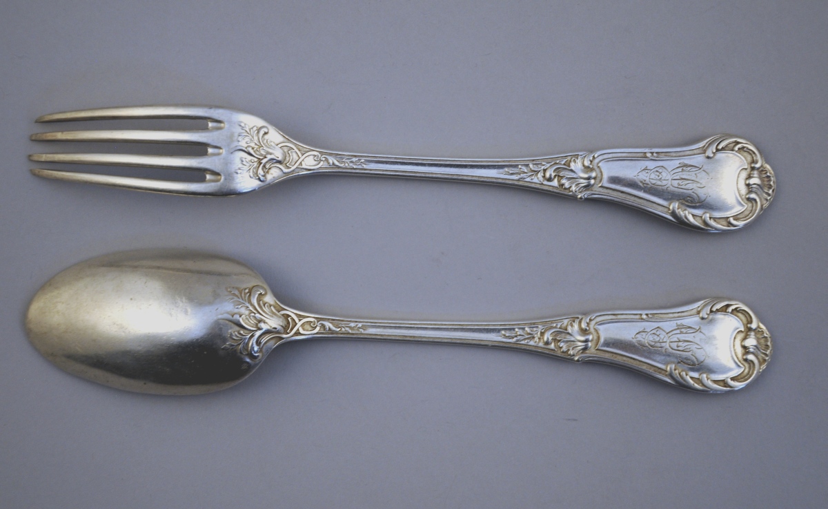 7 COUVERTS en argent, à bords festonnés, à motifs de feuillages en agrafe, monogrammés "BR".