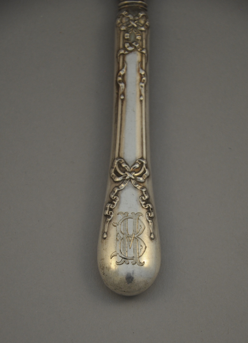 12 FOURCHETTES À HUÎTRES en argent. Manches en argent fourré à décor néoclassique de rubans noués monogrammés "BM".