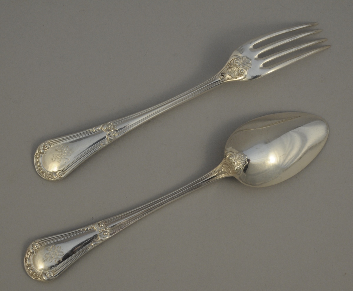 Suite de 12 COUVERTS en argent. Modèle filet à feuilles d'acanthe stylisées et coquille. Monogrammé "N.M.".