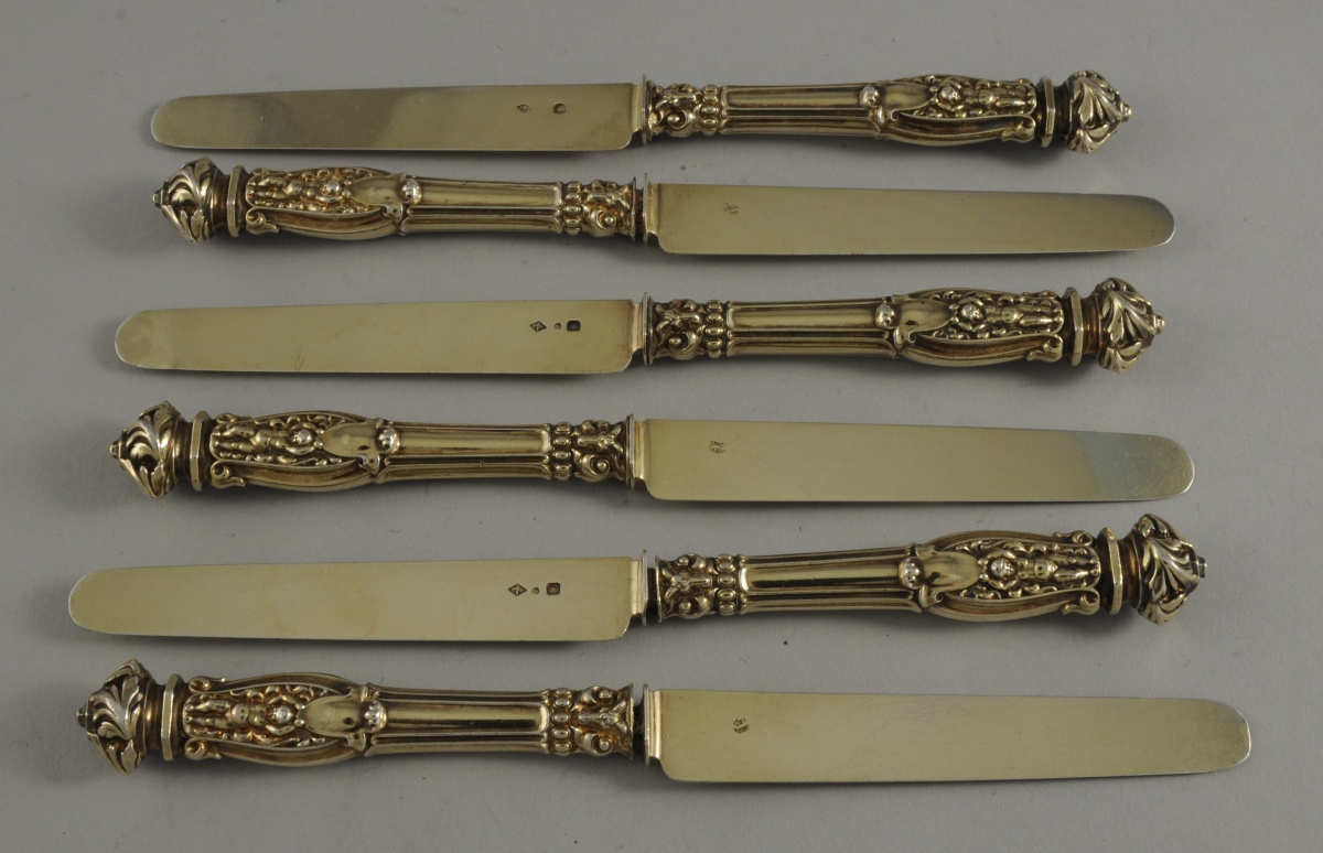 Suite de 6 COUTEAUX À FRUITS, le manche en vermeil fourré à motif de tête de bouc, d'amour et de feuillages, la lame en vermeil. Monogramme "FV".