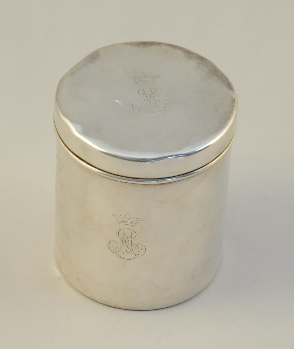 - Partie de nécessaire de toilette en argent uni, 3 pièces, portant le monogramme "MS" timbré d'une couronne de marquis. Il se compose d'une BOÎTE de forme tronconique, d'un FLACON en cristal à pans coupés et d'une BOÎTE À PILLULES. Poinçon Minerve ou hure de sanglier, fin XIXe, début XXe. Maître-Orfèvre: Keller à Paris. Haut. flacon: 11,5 cm.