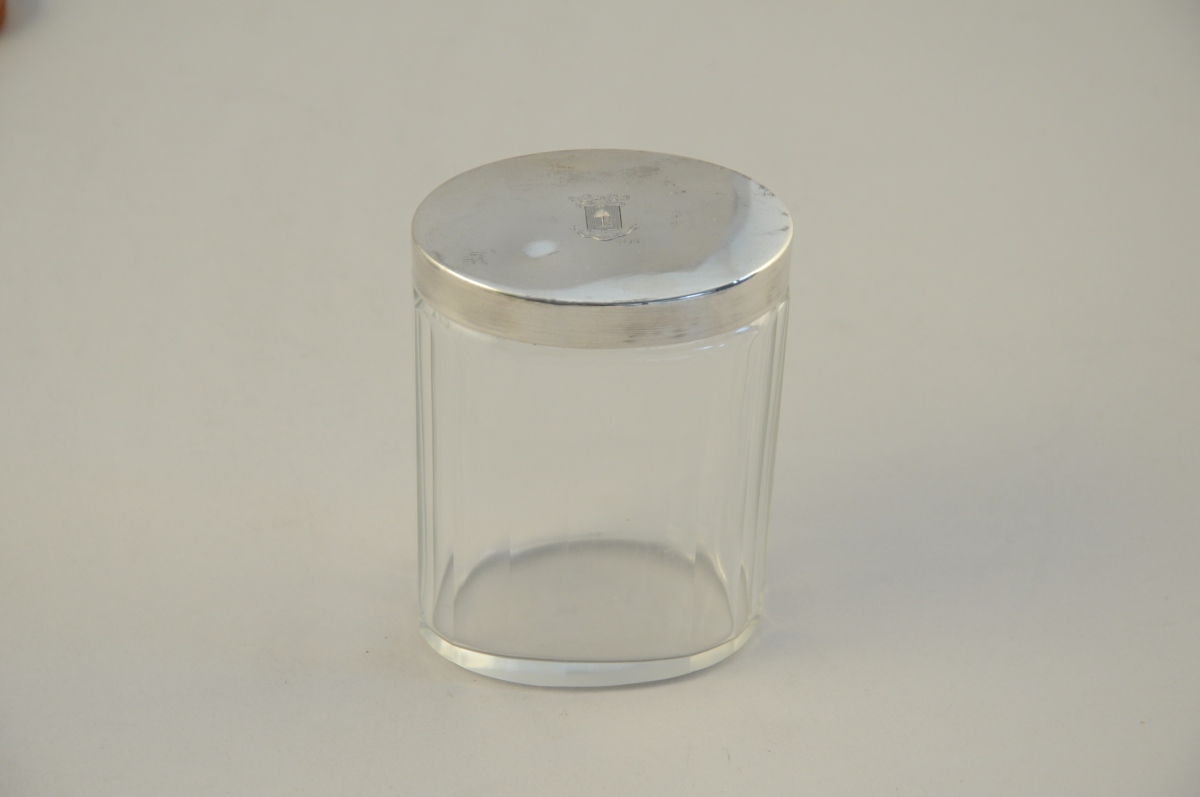 - Partie de nécessaire de toilette en argent uni et cristal à pans coupés, 2 pièces, gravées d'armoiries timbrées d'un heaume et portant la devise "Non devergit". Il se compose d'une BOÎTE À POUDRE et d'une BOÎTE À COTON. Poinçon Minerve, fin XIXe, début XXe. Haut. boîte à coton: 9,5 cm. Poids: 45 g.