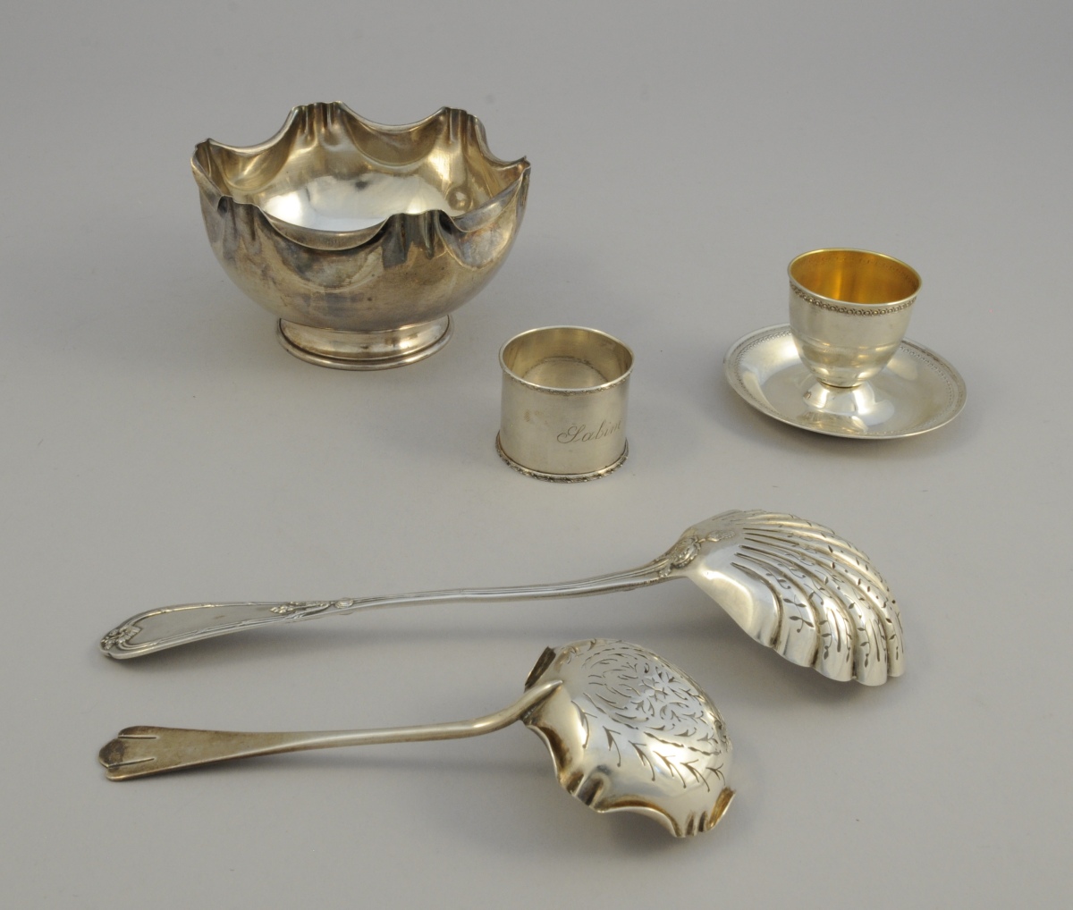 - CUILLÈRE SAUPOUDREUSE, le cuilleron coquille ajouré de rinceaux. Le manche orné de feuillages stylisés, pomme de pin et joncs rubannés.