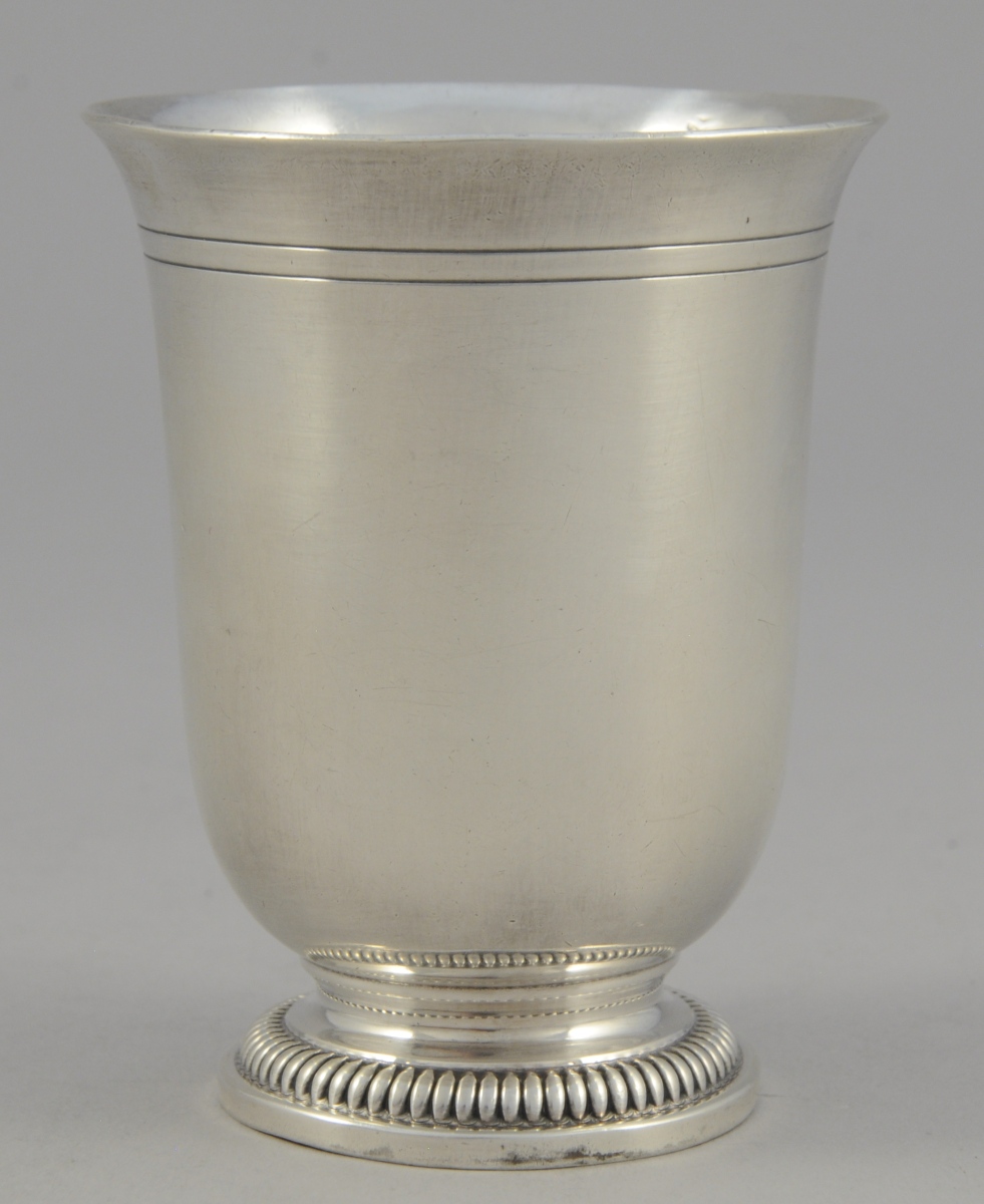 - TIMBALE dite TULIPE en argent uni, le col souligné de filets. Elle repose sur un piédouche orné d'une frise de godrons. Poinçon Minerve, style XVIIIe, XXe. Poids: 120 g.