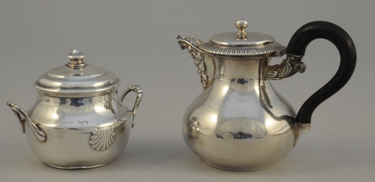 -Petit SUCRIER à panse ornée de deux coquilles. Anses latérales godronnées à attaches feuillagées. Marqué "21 juin 1919 / 21 juin 1944". Poinçon Minerve, style Louis XIV, XXe. Poids: 75 g.
