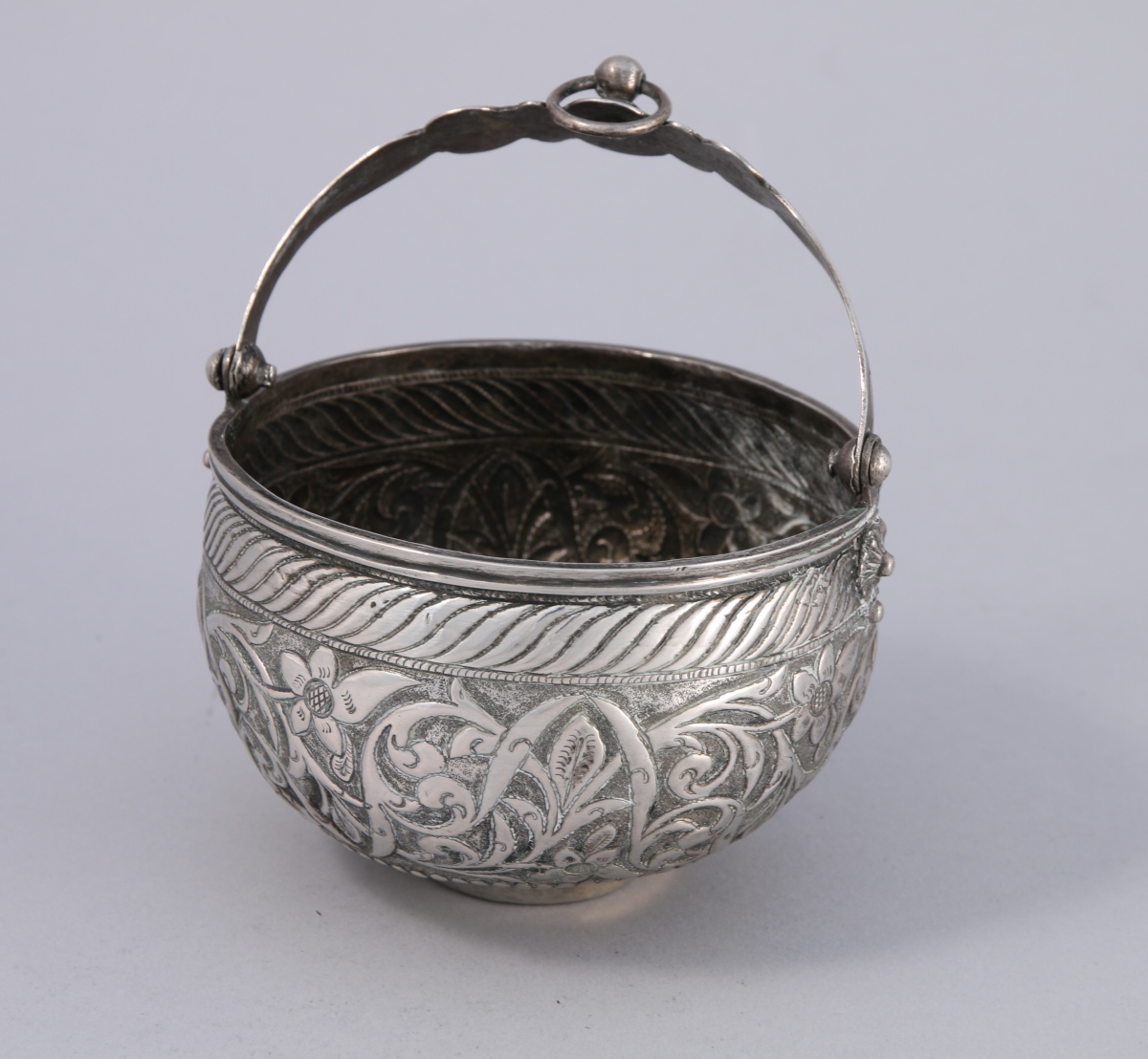 BOL DE HAMMAM dit SETLA de forme circulaire en argent. Le corps à riche décor circulaire repoussé de rinceaux, fleurs et feuillages stylisés. L'anse découpée munie d'un anneau de suspension. Il repose sur un talon orné d'une rosace.