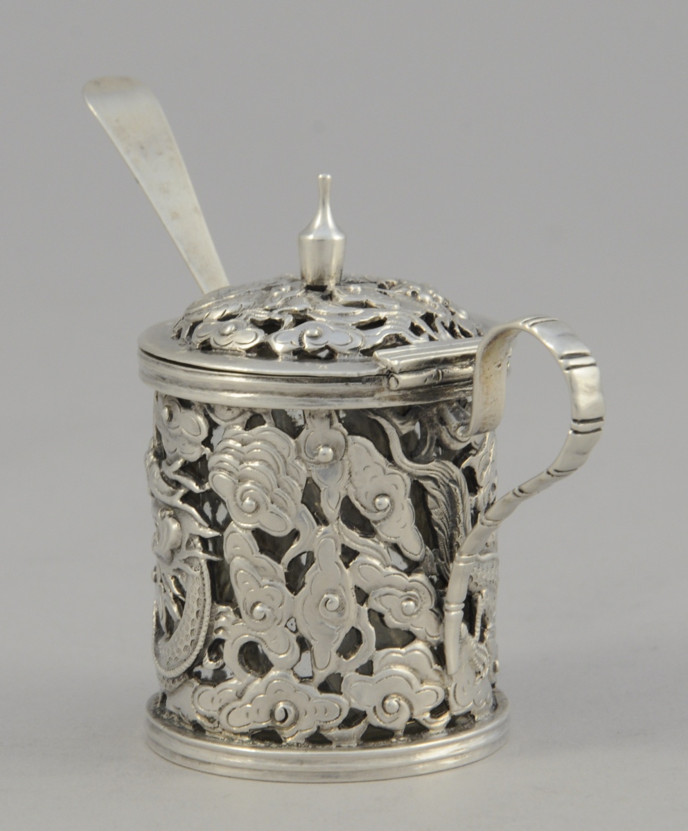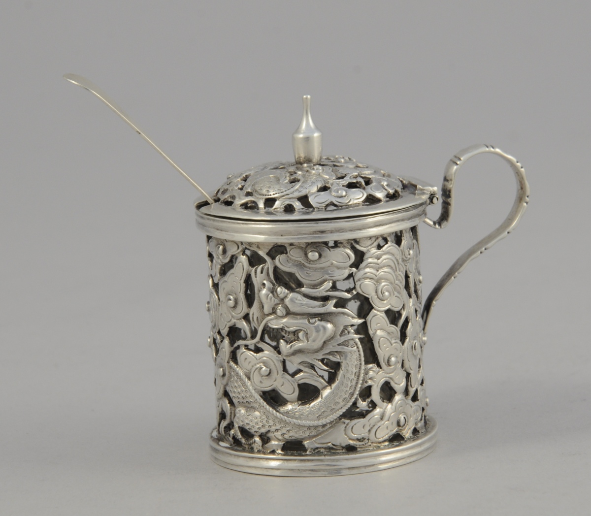 MOUTARDIER en argent ciselé et ajouré de dragon chassant la perle sacrée dans les nuages. Anse. Godet en verre.