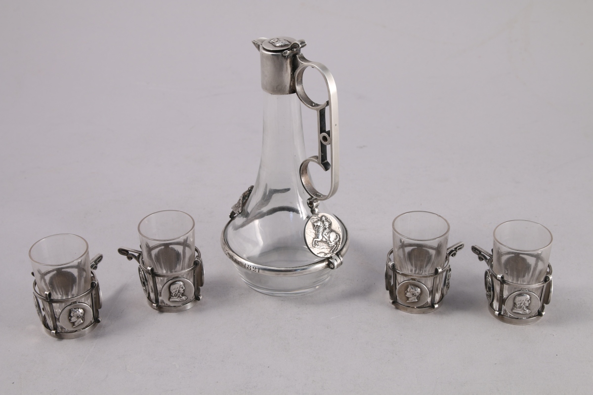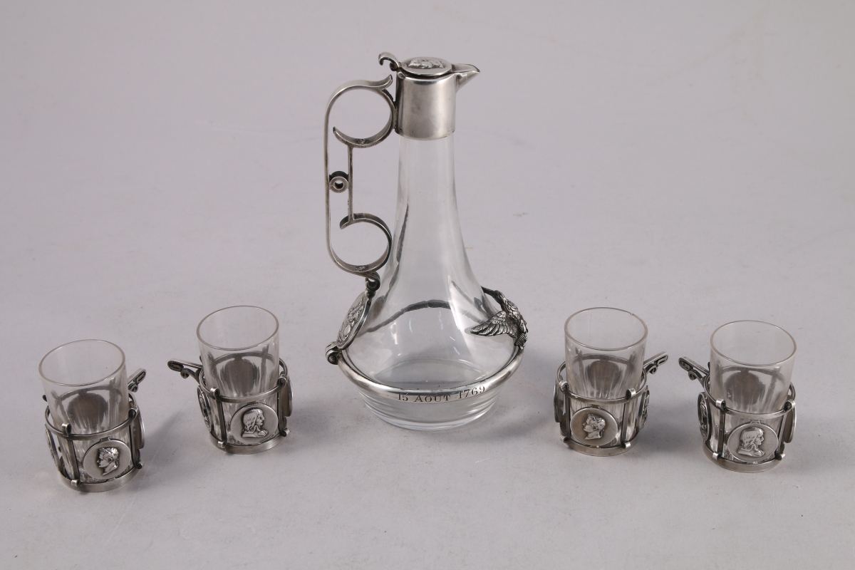 Petit SERVICE À LIQUEUR en argent et cristal comprenant une CARAFE et 4 VERRES ornés d'une aigle napoléonienne et de médaillons aux profils de Napoléon Bonaparte à différents moments de sa vie.