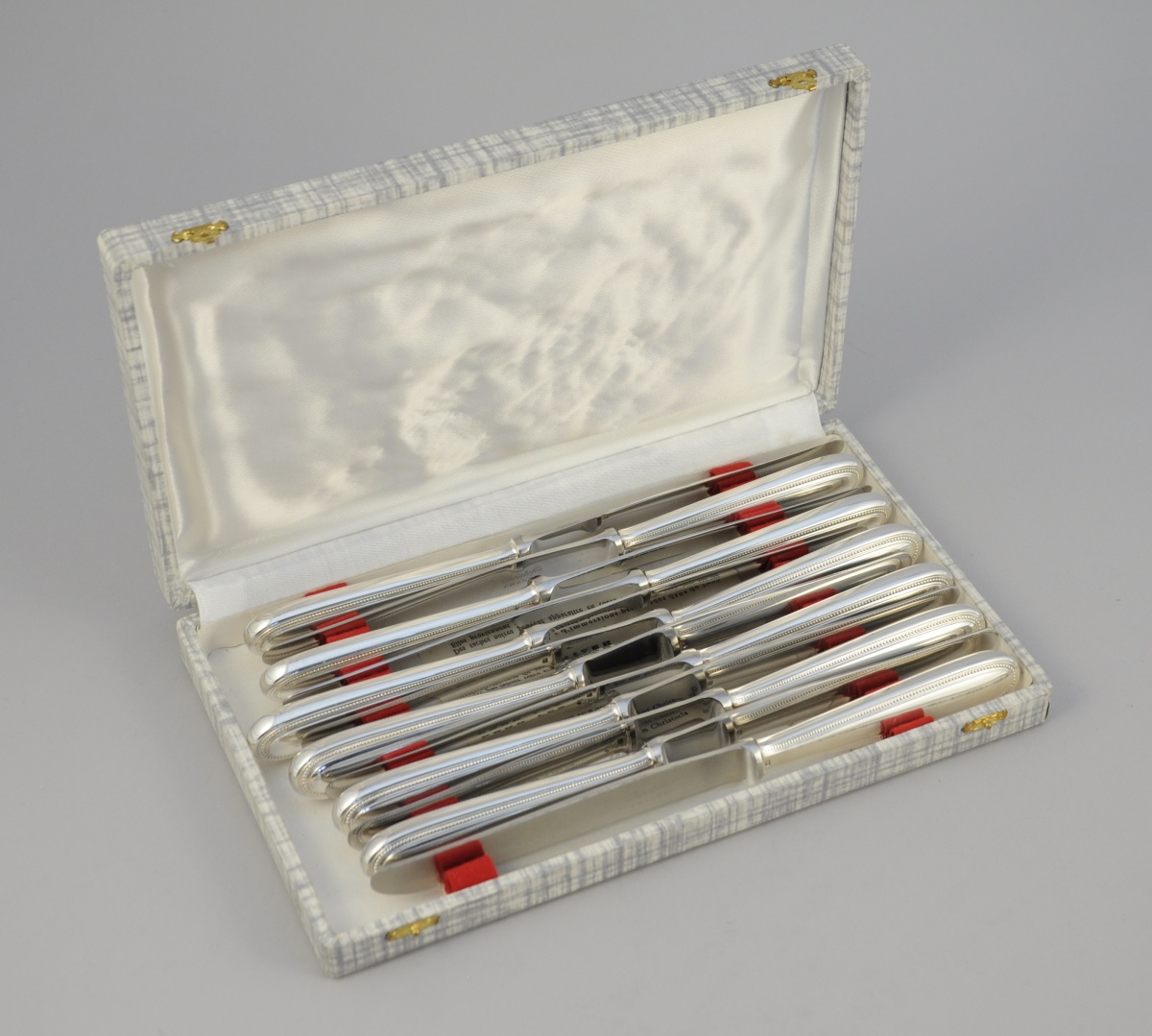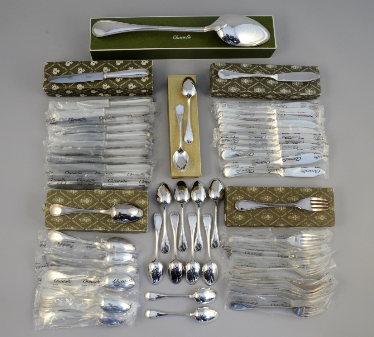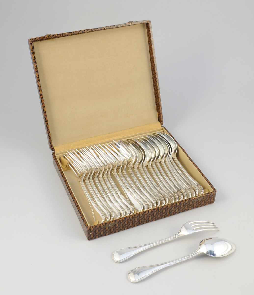 CHRISTOFLE. MÉNAGÈRE en métal argenté, 97 pièces, modèle "Perles". Elle se compose de 12 couverts de table; 12 couteaux de table; 12 fourchettes à poisson; 12 couteaux à poisson; 12 cuillères à entremets; 12 couteaux à entremets; 12 cuillères à café et une cuillère à ragoût.