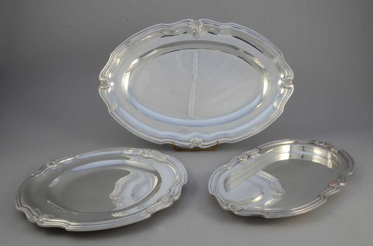 3 PLATS en métal argenté, un rond, deux de forme oblongue, à bords mouvementés et coquilles en agrafes.