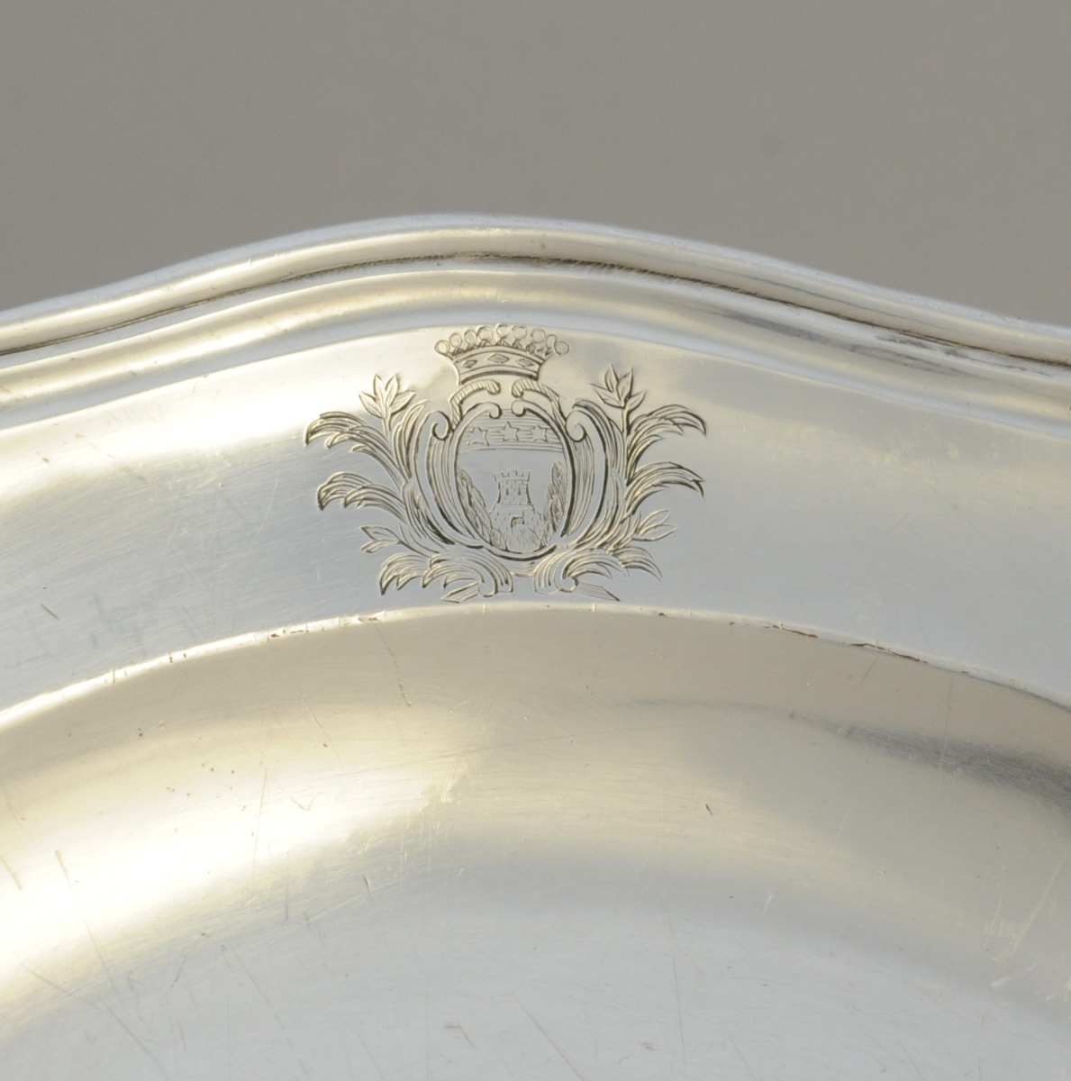 DEUX PLATS formant paire de forme ronde en cuivre argenté. Bordure chantournée à batte contour. L'aile gravée d'armes timbrées d'une couronne comtale.