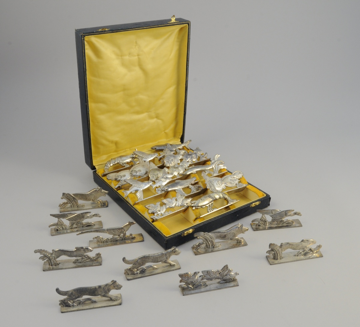 Suite de 23 PORTE-COUTEAUX en métal argenté figurant divers animaux tels que chien, canard, exocet, sanglier, poissons, lièvres, cailles...
