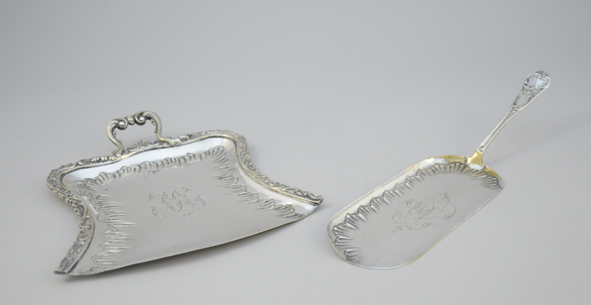 -RAMASSE-MIETTE, pelle et plateau monogrammés "DC". Riche décor de feuilles d'acanthe stylisées, coquilles et volutes. Style Louis XV, fin XIXe-début XXe.