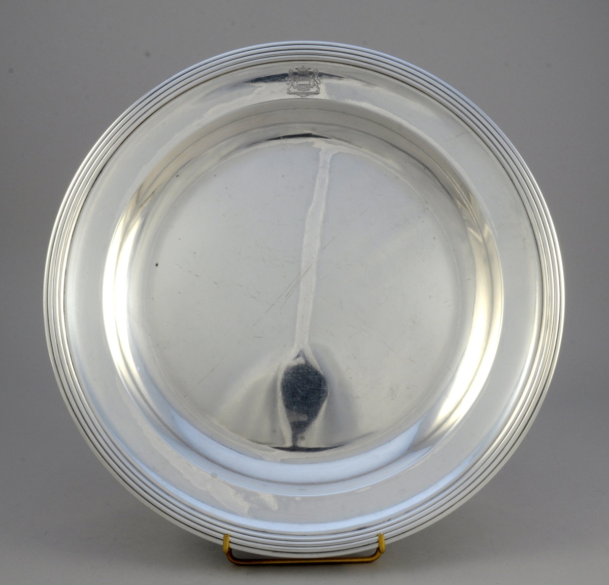 CHRISTOFLE. PLAT rond en métal argenté aux armes de la famille de Chefdebien Zagarriga timbrées d'une couronne de marquis et soutenues par des lions. L'aile ornée de filets.