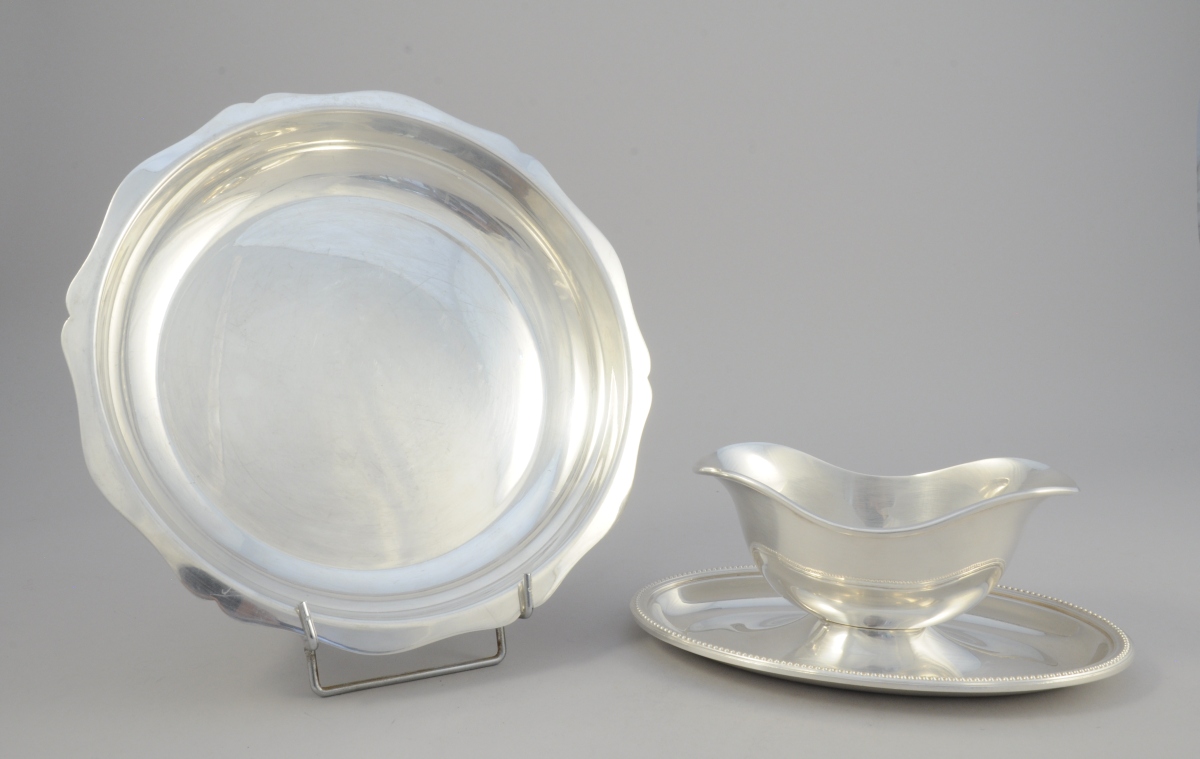 - SAUCIÈRE à plateau adhérent de forme ovale. La bordure du plateau ornée d'un rais de perles. Style néoclassique. Haut. 8,5, Long. 23 cm.