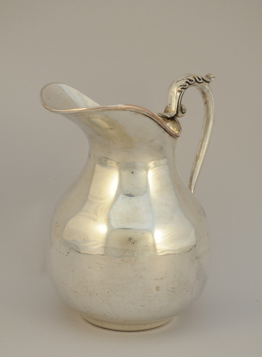 BROC à panse basse et large bec en métal argenté. Anse ornée d'une volute et de feuillages stylisés.