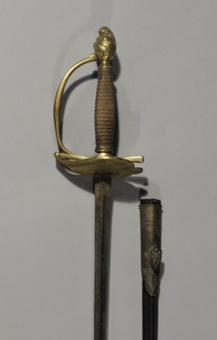 ÉPÉE D'UNIFORME, premier modèle. Plateau en lyre asymétrique avec cannelures sur le pourtour et quillon en palmette. Quillons droits quadrangulaires, fusée filigranée de cuivre et pommeau au casque empanaché du modèle d'officier d'état-major Vendémiaire, lame triangulaire. Ciselée au tiers d'arabesques dorées et quadrillages. Fourreau en cuir. La chappe ciselée de motifs feuillagés, le pontet en forme d'écu renfermant une palmette.